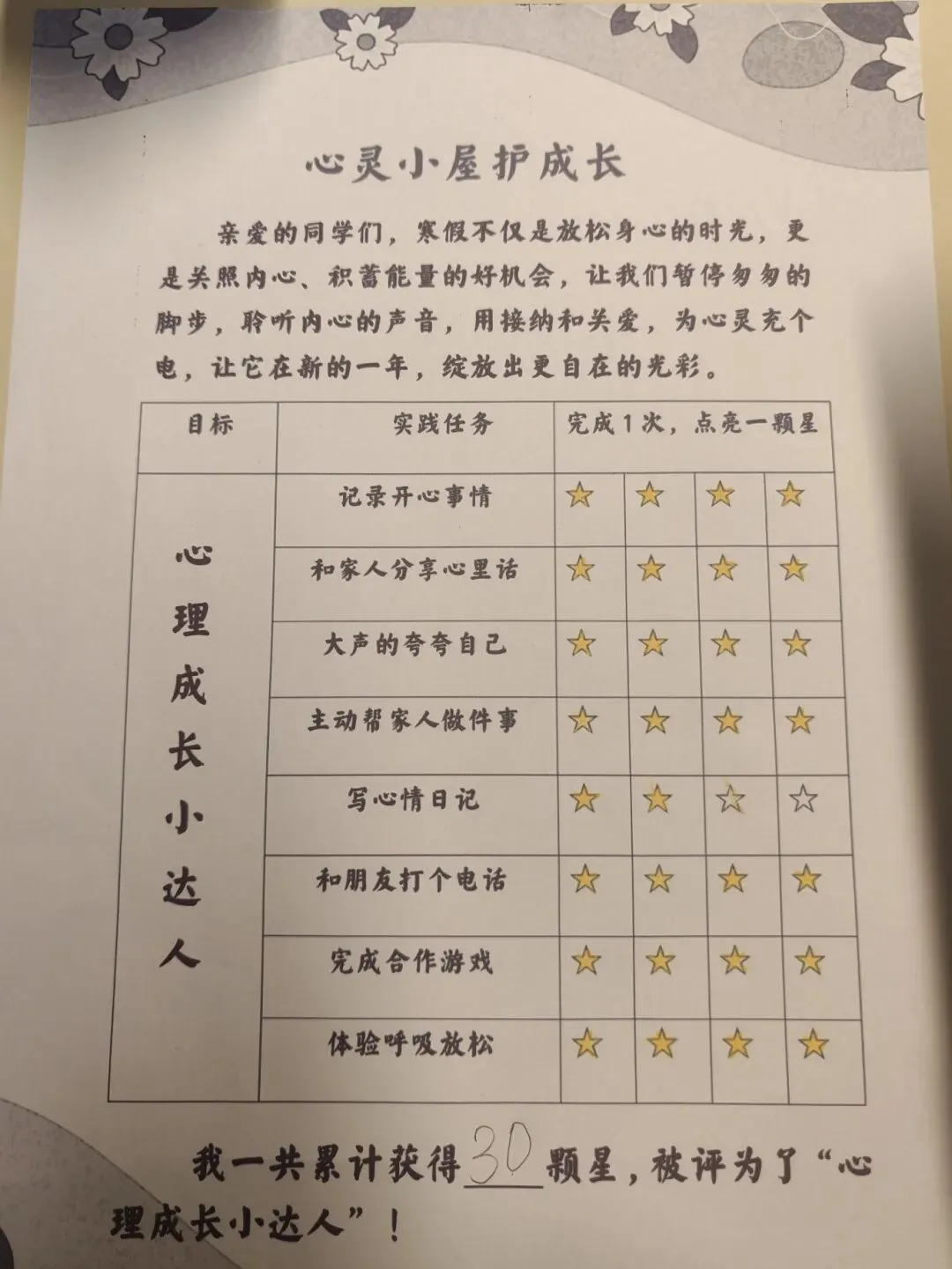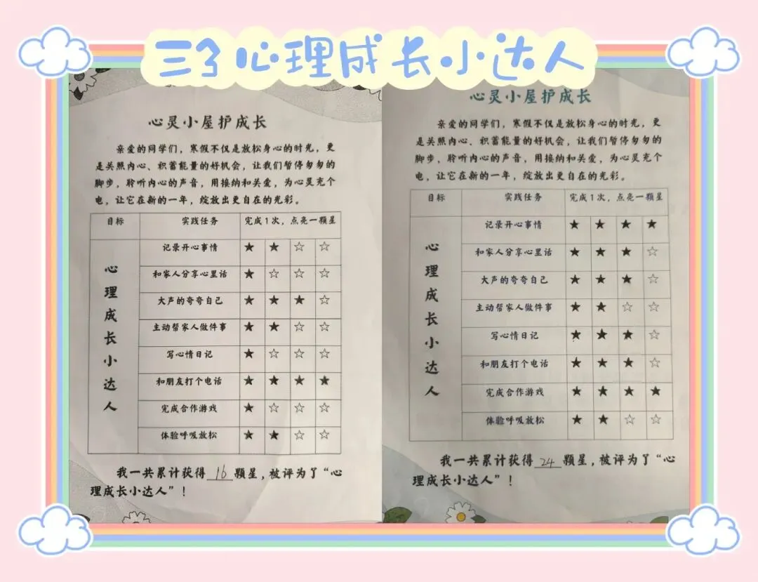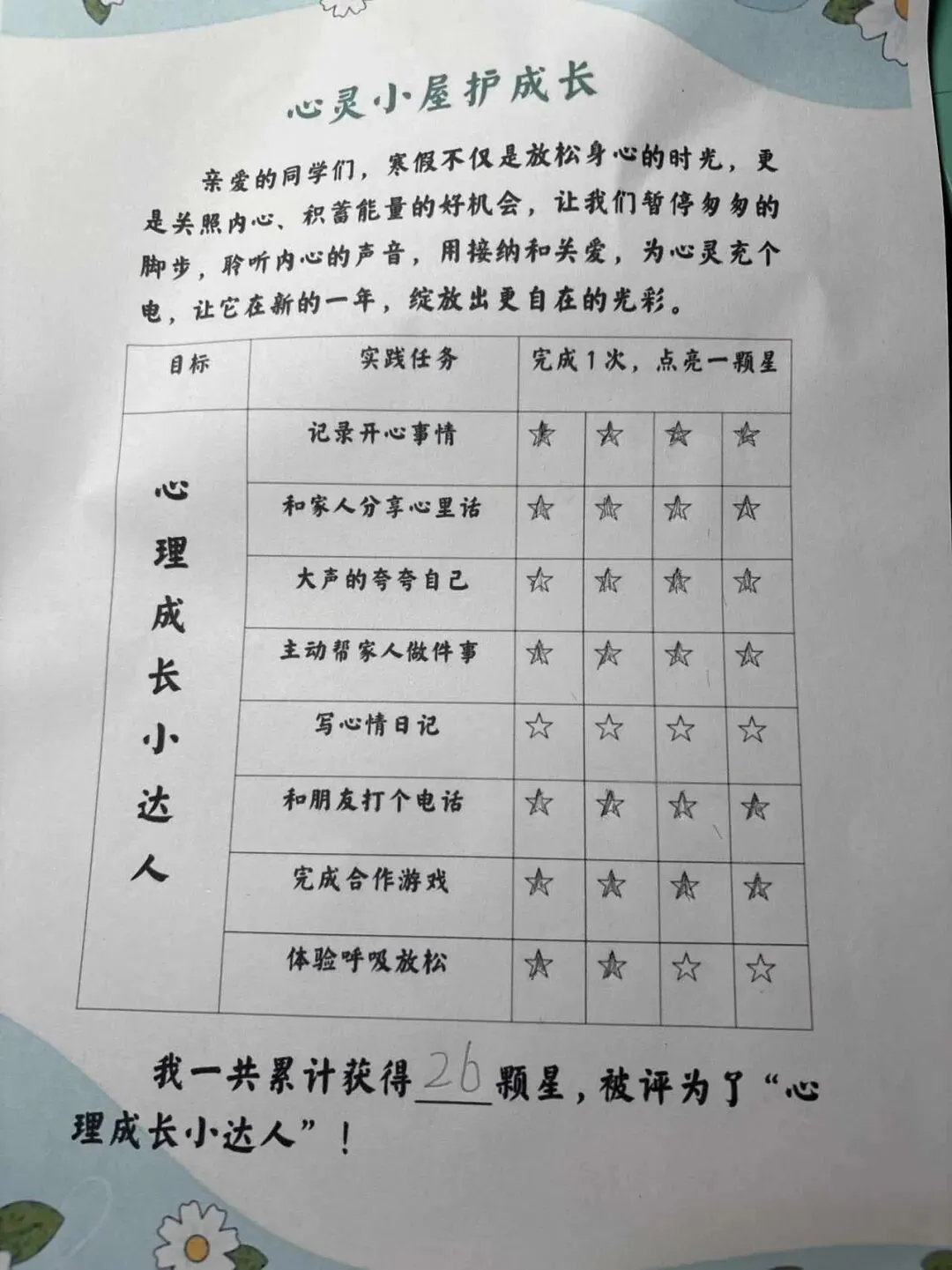 为了让同学们在假期里感受生活美好、学会情绪表达、增进亲子联结,学校为孩子们量身定制了特色心理作业。从亲子共读的温暖陪伴,到创意满满的心灵创作,每一份作业都藏着对同学们心理健康的用心呵护。一张张用心的作品、一个个温暖的瞬间,都成为这个寒假里最珍贵的心灵印记。