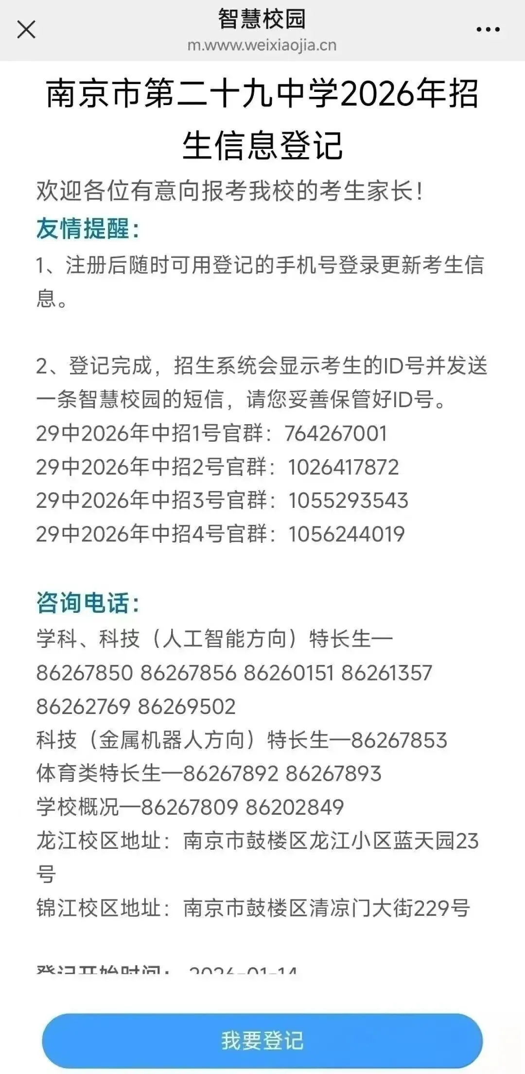 今天我们整理了现阶段南京多所热门高中的中招信息登记(含特长生)和招生咨询的内容。