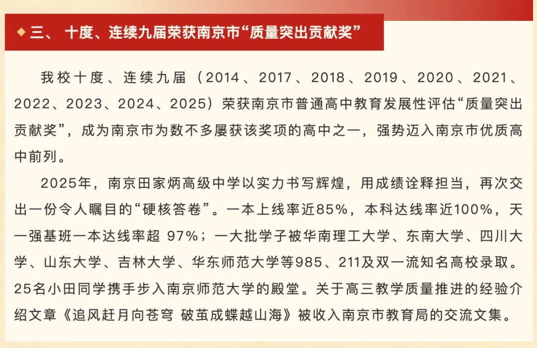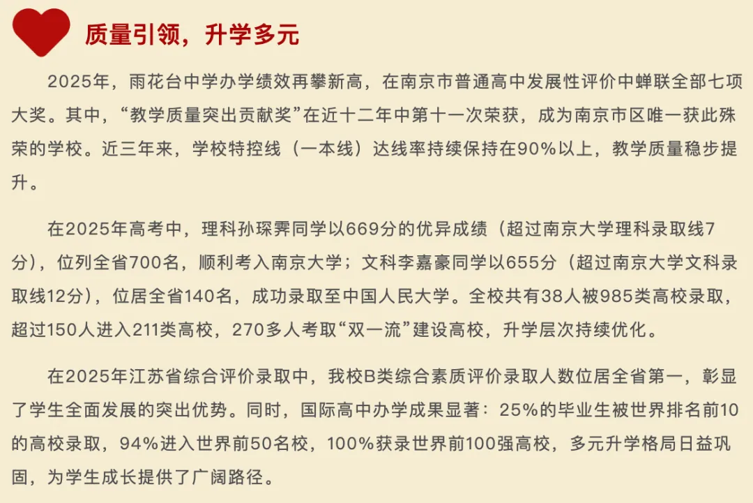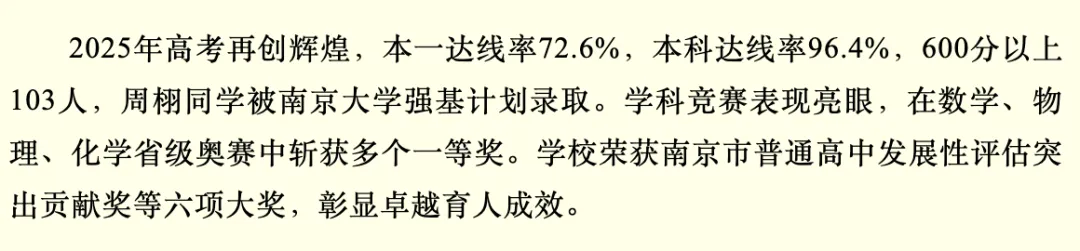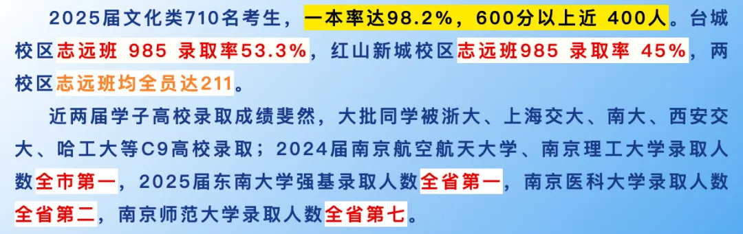 2025高考,一本达线率98.2%,600分以上近400人。台城校区志远班985录取率53.3%,红山新城校区志远班985录取率45%,两校区志远班均达211。