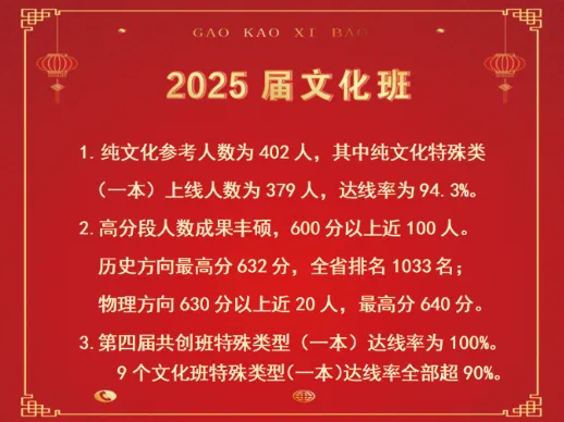 2025高考,纯文化参考人数为402人,一本达线379人,达线率94.3%。高分段,600分以上近100人。历史方向最高分632分,省排名1033名;物理方向630分以上近20人,最高分640分。共创班特殊类型一本达线率100%。
