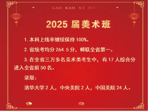 美术班,本科上线率维持100%,省统考均分264.5分,蝉联全省第一。在全省三万多名美术类考生中,有17人综合分进入全省前50名。清华2人,中央美院2人,中国美院24人。