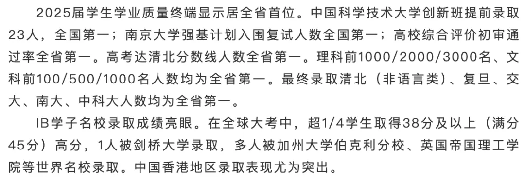 中国科学技术大学创新班提前录取23人,全国第一;南大强基入围复试人数全国第一;高校综评初审通过率全省第一。