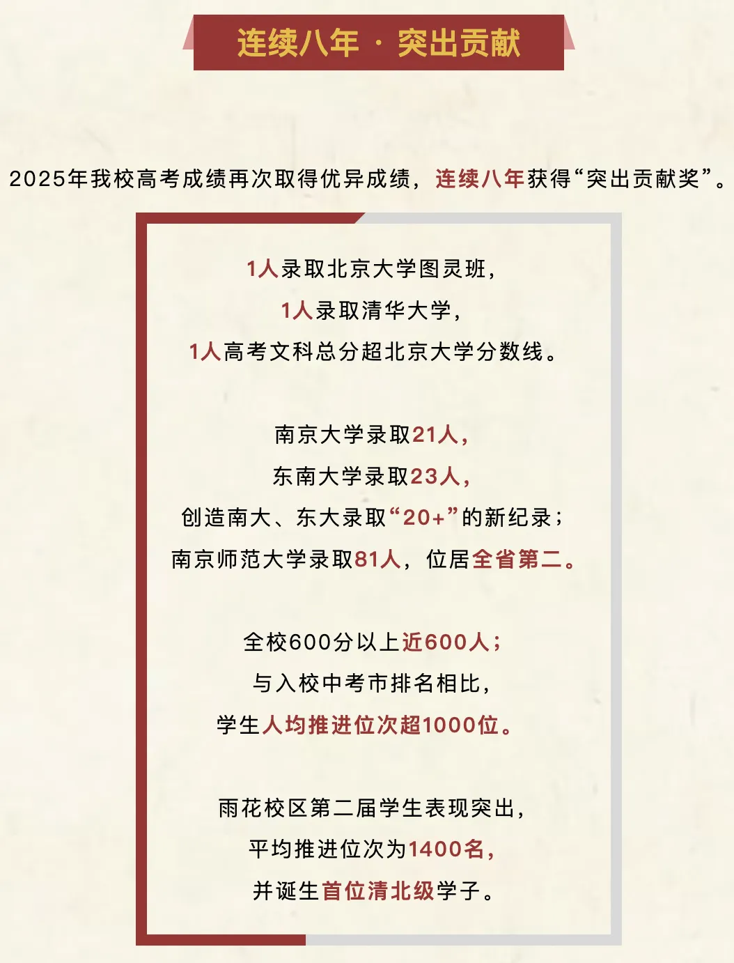 2025高考,清北录取2人;南大录取21人;东南录取23人;南师大录取81人,位居全省第二。600分以上有近600人,与入校中考市排名相比,人均推进位次超1000位。