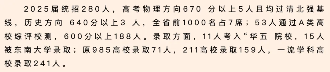 2025高考,物理方向670分以上5人且均过清北强基线,历史方向640分以上3人,全省前1000名占7席;53人通过A类高校综评校测,600分以上188人。