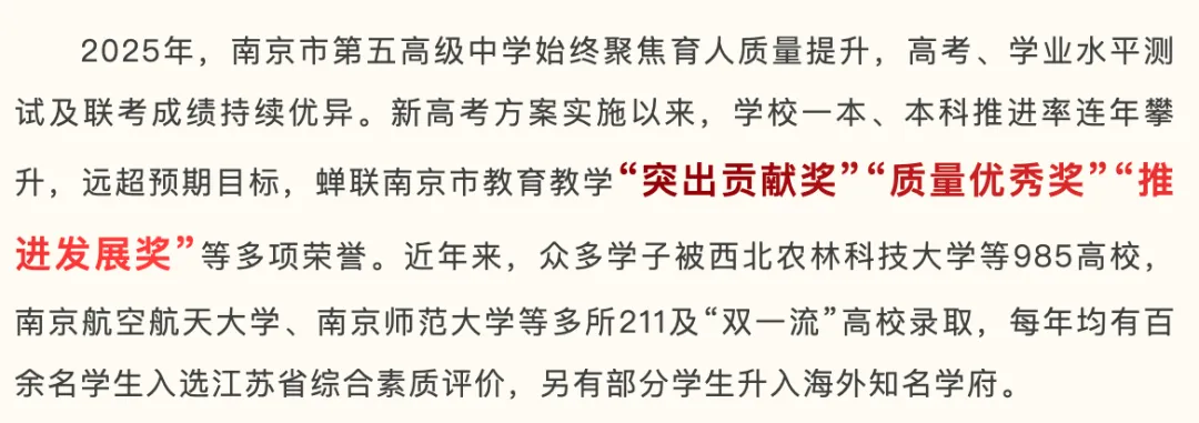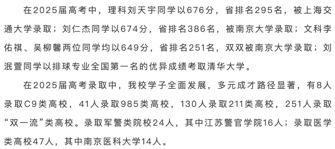 2025高考,理科高分刘天宇同学以676分,省排名295名,被上海交通大学录取;刘仁杰同学以674分,省排名386名,被南大录取;文科高分,李佑祺、吴柳馨两位同学均以649分,省排名251名,双双被南大录取。