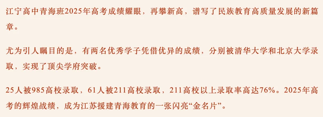 另外,江宁高中青海班,有2人分别被清华、北大录取,25人被985高校录取,61人被211高校录取,211高校以上录取率高达76%。
