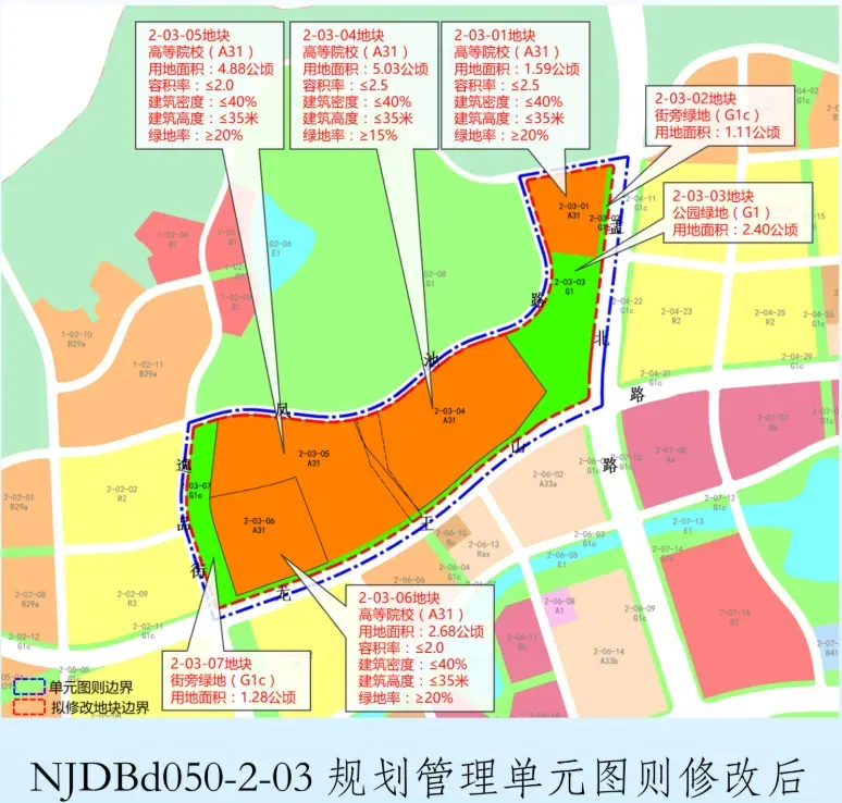 先是去年11月,“《南京市 NJDBd050单元控制性详细规划》NJDBd050-2-03规划管理单元图则修改”批后公布,青龙地铁小镇大批科研用地确认调规,调整后新增高等院校用地14.18公顷。