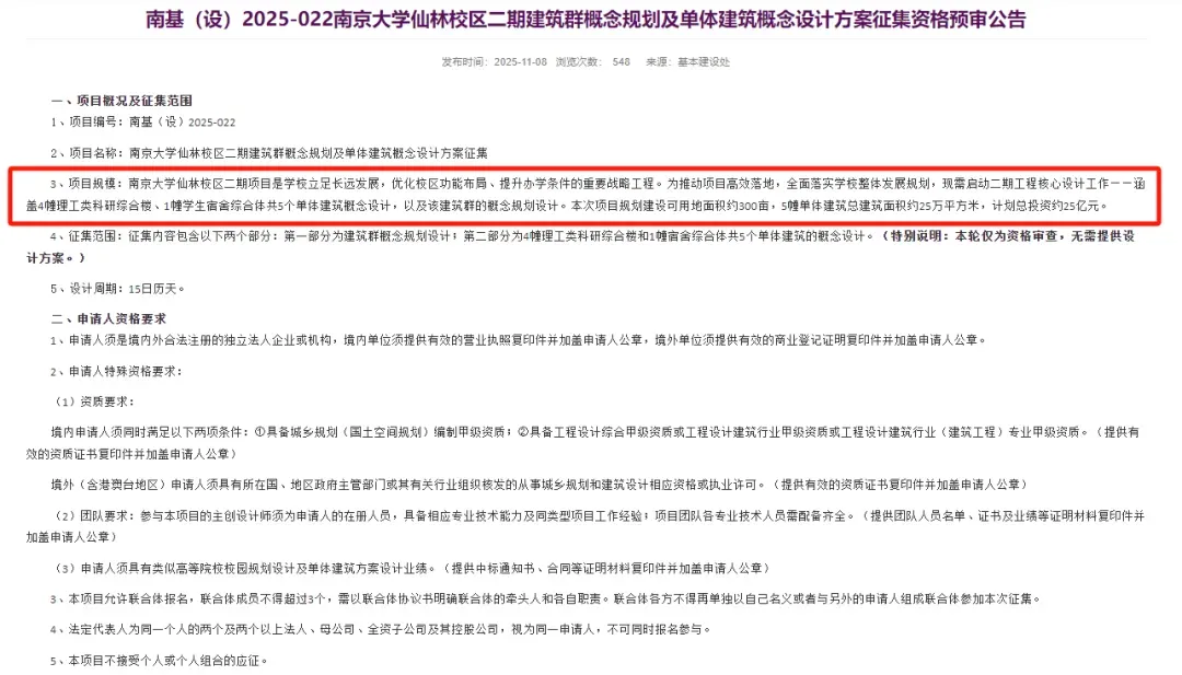然后就是今年1月份,南大基建处发布了“南集(设)2026-001南京大学仙林校区未来技术楼A幢项目、南京大学仙林校区信息工程与技术楼A幢项目和南京大学仙林校区信息工程与技术楼B幢项目勘察设计公开招标公告”。