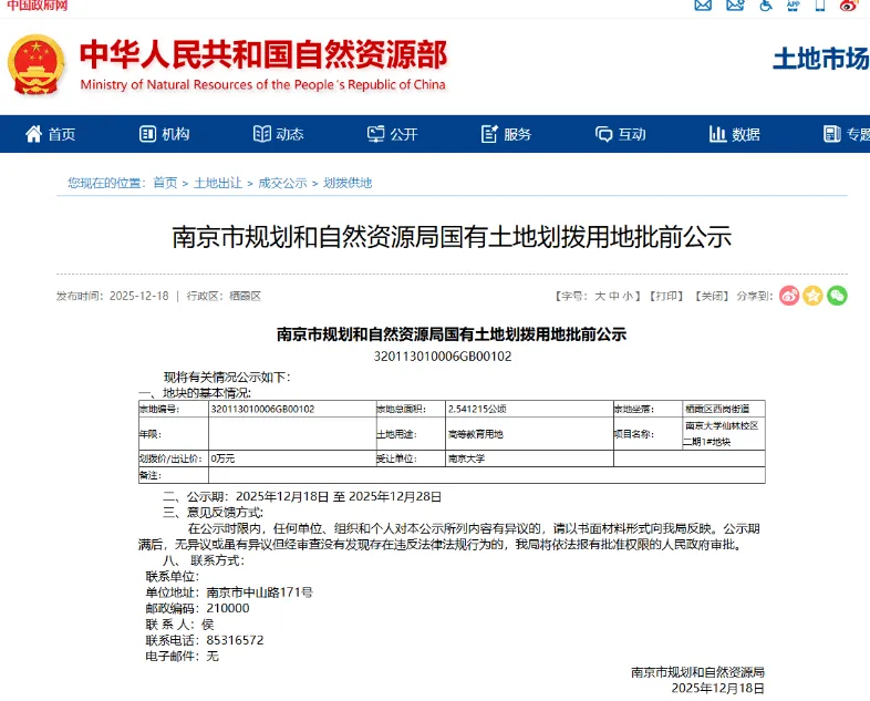 紧接着去年12月,南京市规划和自然资源局连续发布多则国有土地划拨公示——南京大学仙林校区二期1#地块、2#地块,总面积超过7.5公顷,用途均为高等教育用地,受让单位为南京大学。