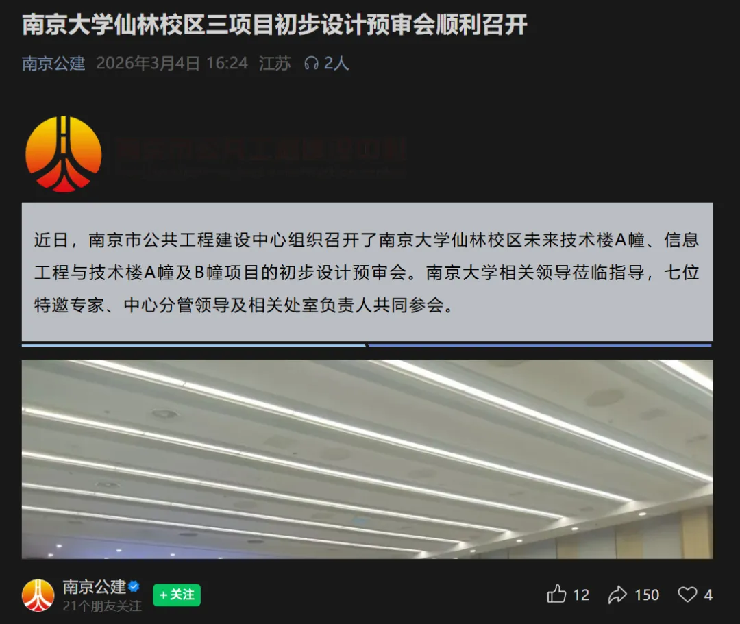 再就是最近3月初,南京公建官方发文《南京大学仙林校区三项目初步设计预审会顺利召开》,其中提到:南京市公共工程建设中心组织召开了南京大学仙林校区未来技术楼A幢、信息工程与技术楼A幢及B幢项目的初步设计预审会。