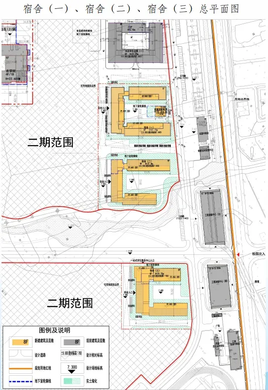 项目计划分两期建设:一期工程可容纳10000名学生规模,规划建筑面积约20万m²,主要建设内容包括教室、实验实习用房、学生宿舍、食堂、文化体育设施等。