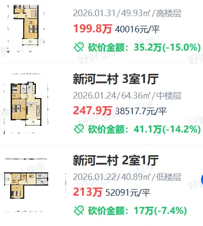 曾经卖到近10万/㎡的怡景花园,如今单价"3"字头就能拿下,一套45㎡房源总价仅204.5万。新河二村两室一厅总价控制在250万以内,王府园小区甚至一百多万就能入手。恒盛金陵湾成交均价已从去年11月的4.4万/㎡降至今年1月的3.9万/㎡以内。