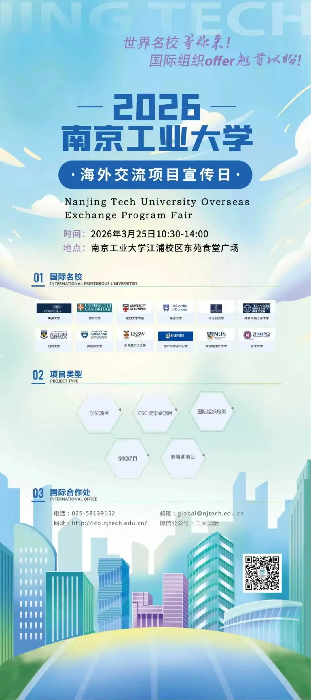 为深入推进学校国际化人才培养战略,拓宽学生全球视野,搭建高质量海外学习交流平台,国际合作处将于2026年3月25日(周三)10:30—14:00,在江浦校区东苑食堂广场举办“2026南京工业大学海外交流项目宣传日”活动。诚邀广大同学踊跃参与,现场了解项目详情,规划未来国际发展路径。