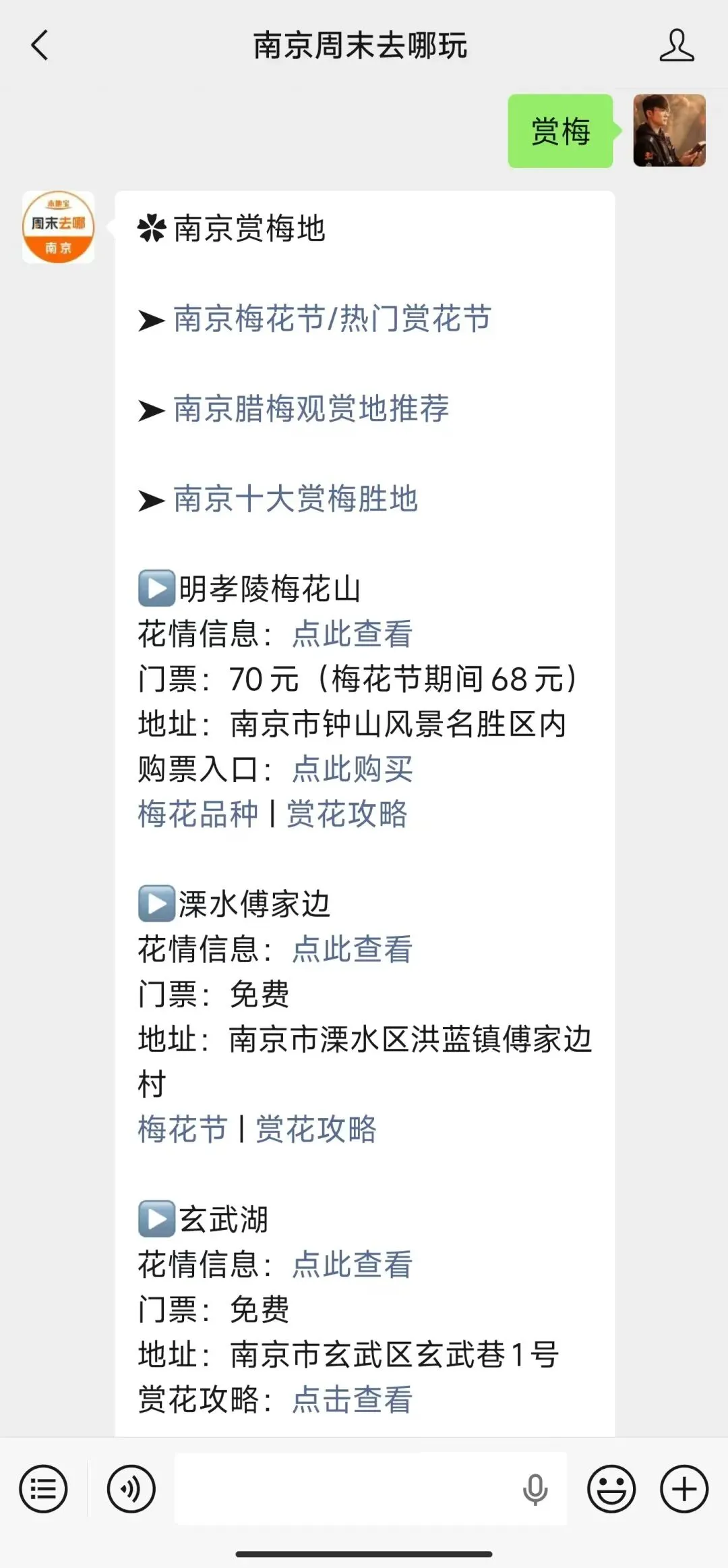 小编提醒:扫描下方二维码,关注【南京周末去哪玩】公众号,私信回复【赏梅】即可获取南京最佳赏梅期、南京腊梅观赏地等信息