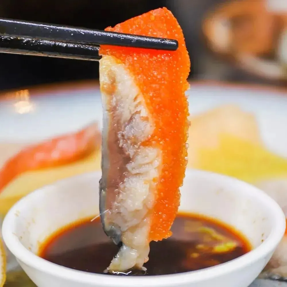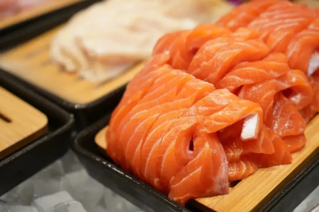三文鱼、金枪鱼、鲷鱼...新鲜的食材,色泽艳丽,现场厚切,保证了鱼的鲜度。蘸上酱料,就能感受鲜味本鲜!