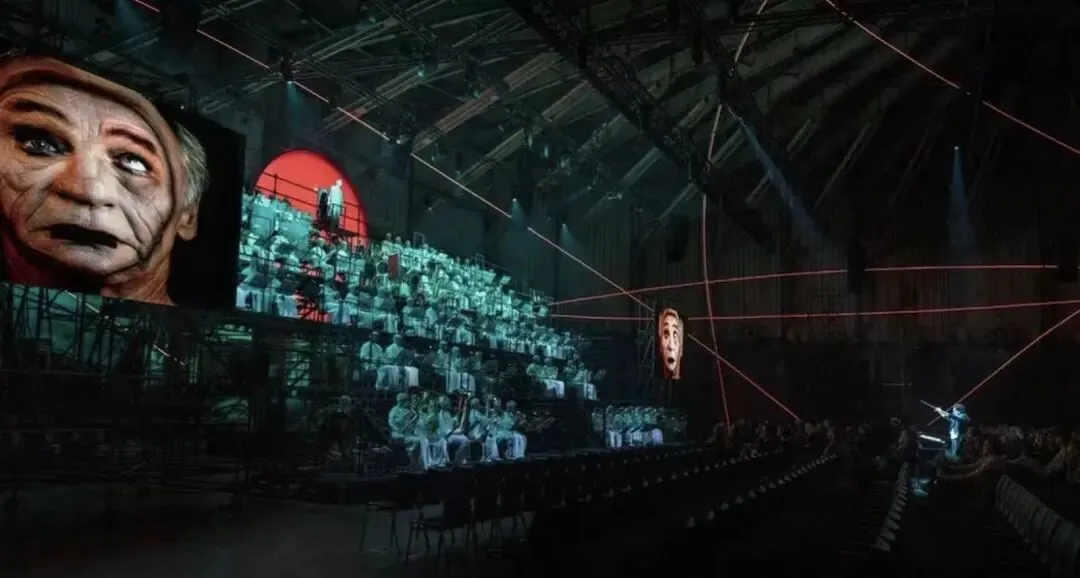 他的另一作品,三个管弦乐队被放在演出空间的不同区域,观众坐在中间被包围着,不仅是演出,还是实验:音乐家和观众的感受随着位置变化有何改变。