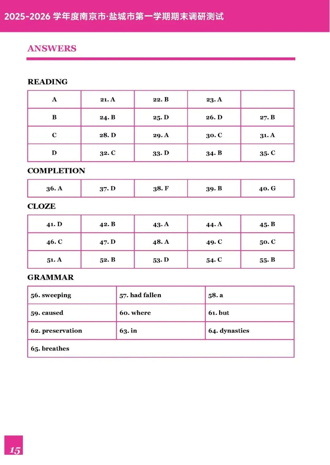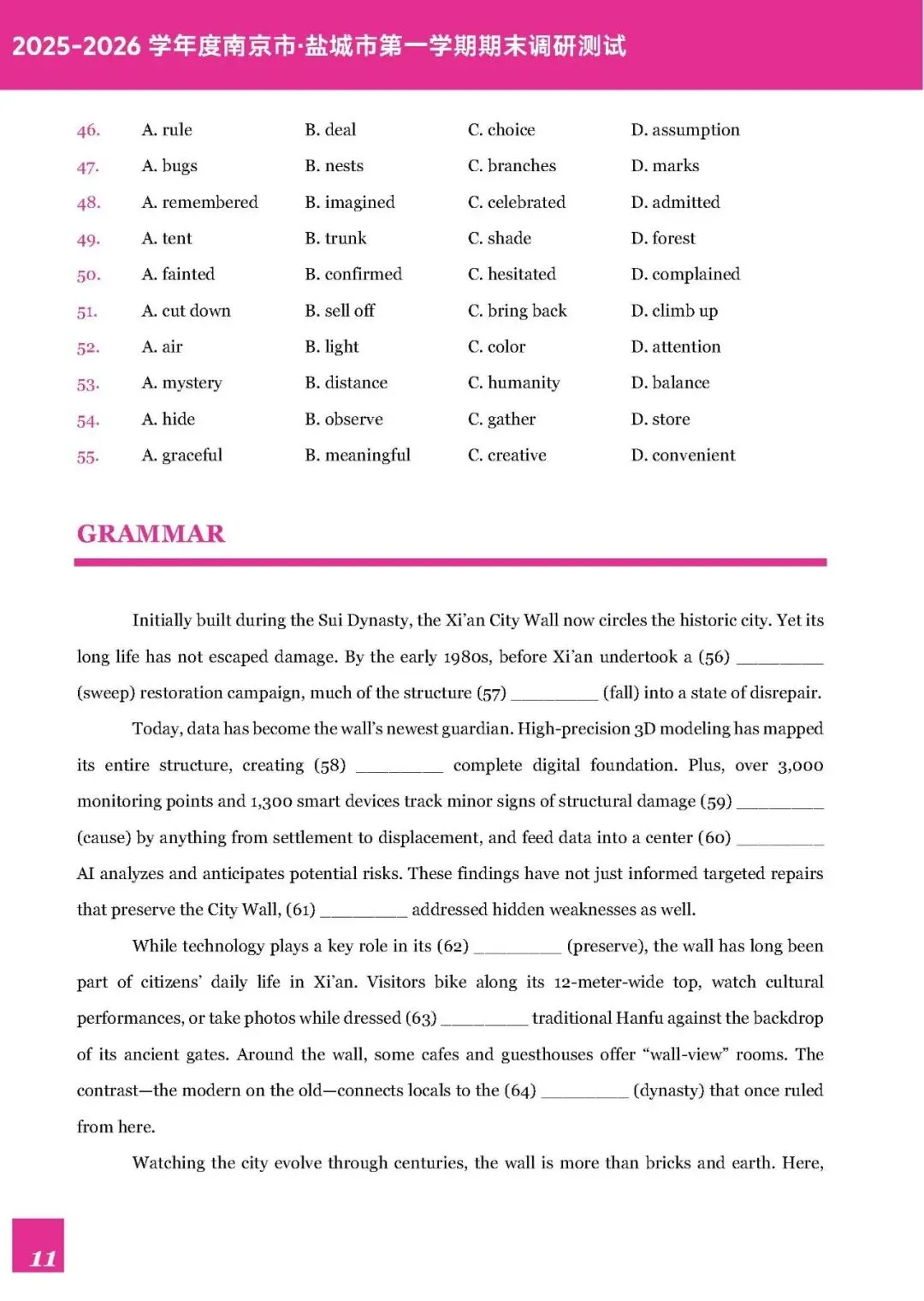 56. sweeping 考察非谓语作形容词。空格谓语冠词和名词之间,考察变形容词,根据动作后出现作用对象,主动关系,答案-ing形式。57. had fallen 考察谓语时态。本句缺谓语,先判定时间:截止到2025,截止到过去,从过去到过去,考察过去完成时。这个时态考察的频率不高,错了不用纠结,记住标志词by+过去时间就行。58. a 考察冠词。前面非谓语creating,空格后形容词+名词foundation结构,空格缺冠词修饰,看不懂本空原理的,给自己造个小学生句子:meeting a beautiful girl——本空同理。59. caused 考察非谓语。谓语是track,到空格为止无连词出现,确定非谓。空格后出现by提示,答案过去分词结构。60. where 考察从句连词。and并列谓语feed,空格后谓语analyzes和anticipates并列,即空格前后都出现句子;前句center名词结尾,出现名词+句子结构——常考察定语从句,而后句内容完整,不缺主干成分,缺介词+名词成分,center抽象地点名词,答案where。61. but 考察并列连词。本题为无难度题型——前面出现not just,在功能上等同于not only..., 缺连词but (also)。62. preservation 考察词性转换。空格谓语介词in短语区间内,空格动词转名词即可。错了的,自行积累。63. in 考察介词。无难度题型。小学基本功——in+衣服表达穿着。64. dynasties 考察名词复数。空格前冠词the,后需要名词,括号单词为名词,即名词+名词=2名词,变复数即可。65. breathes 考察谓语时态。本句出现and提示,空前谓语meets,前后并列,考察一般现在时,呼吸为主动逻辑(不及物理解也行),非被动,前后时态对应。