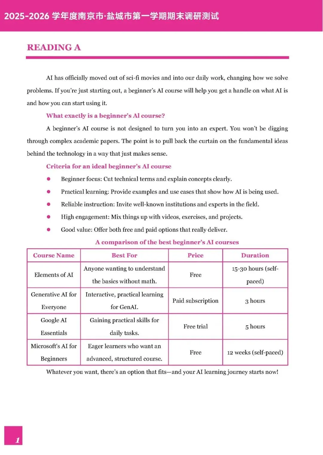 试卷源于网络,本号重新排版,请搬运时保留水印或注明试卷来源。获取【试题版】请在文章末尾回复:南京·盐城期末 点击阅读原文跳转21. A 细节题。题干信息直接告知我们定位细节到第一个标题处,重点句提示:The point is to pull back the curtain on the fundamental ideas behind the technology in a way that just makes sense. 各位其实也能够在21/22的题干和首段看到蛛丝马迹,问到的部分是beginner人群,新手必然从基础部分开始;这样看来的话,23题和21题的提问方式正好相反,已知:一群学习AI的人倾向于基础,问选表格哪个课程?∴哪个是基础层面就选哪个AI课程——答案A选项→Anyone wanting to understand the basics...22. B 细节题。对应到第二个标题处,第二个黑点处可以直接看到: