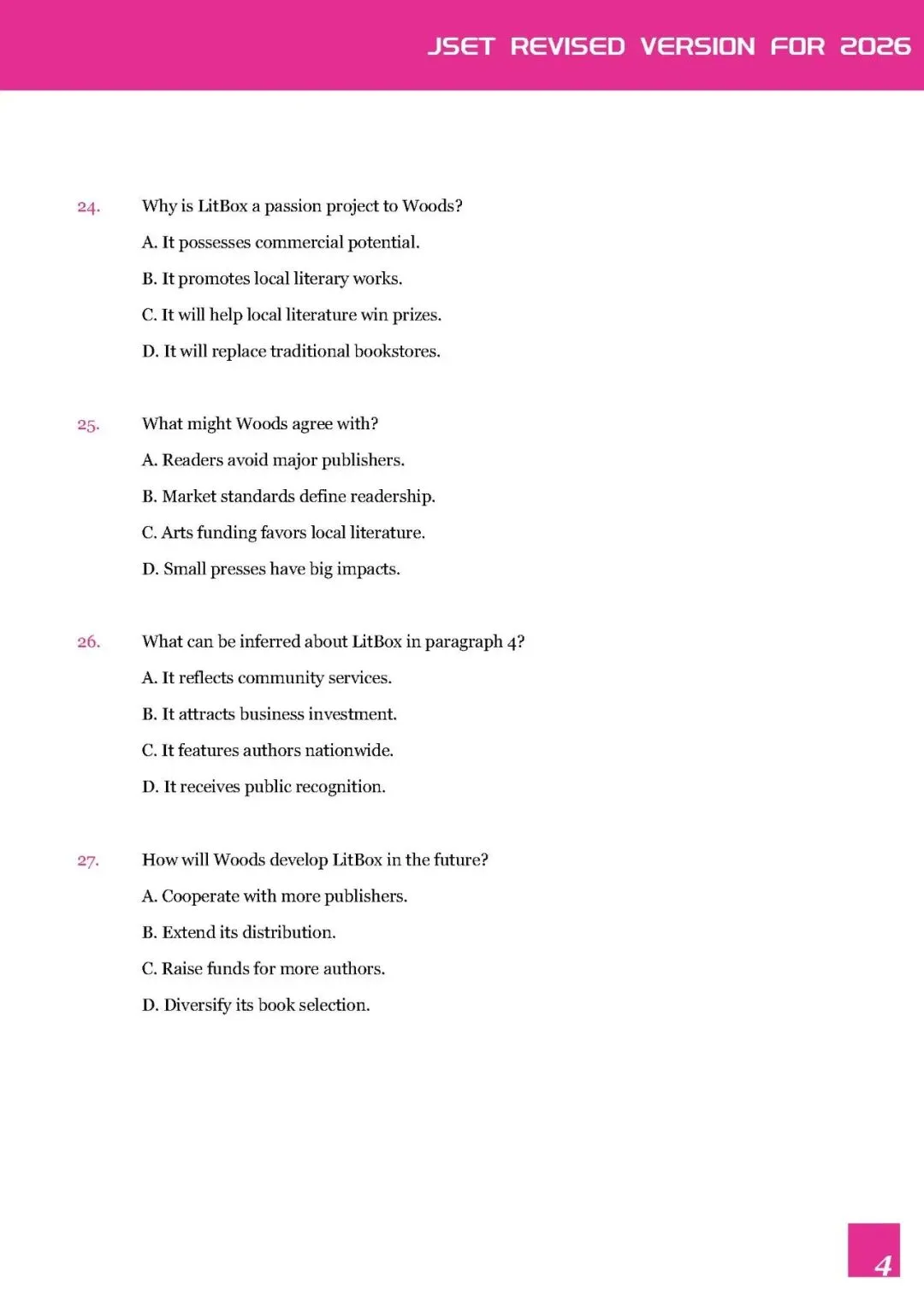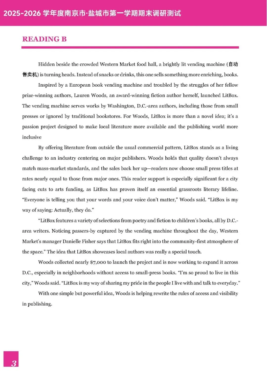 24. B 细节题。题干信息对应2段——专有名词在原文比较容易定位:For Woods, LitBox is more than a novel idea; it’s a passion project designed to make local literature more available and the publishing world more inclusive.