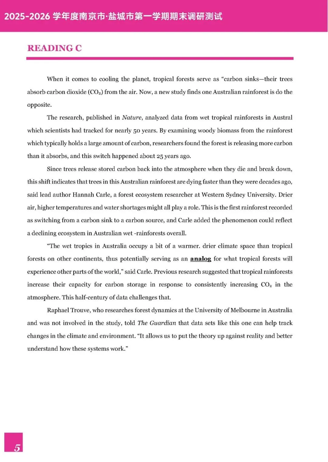 28. D 细节题。本题在1/2段分别都给出了明显提示:1段:their trees absorb carbon dioxide (CO2) from the air. Now, a new study finds one Australian rainforest is do the opposite.树木从空气中吸收二氧化碳。新的研究发现,澳大利亚的热带雨林却恰恰相反。