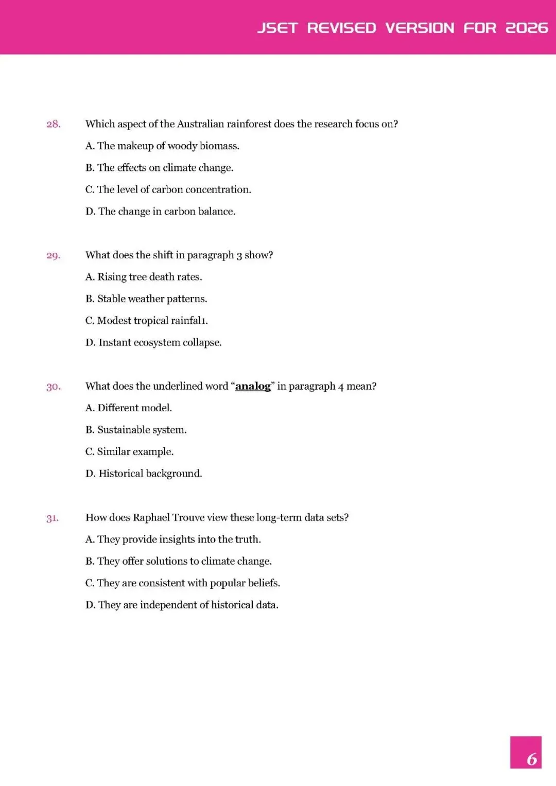 29. A 细节题。题干shift在3段开头句直接给出对应,且含有从句:this shift indicates that trees in this Australian rainforest are dying faster than they were decades ago.