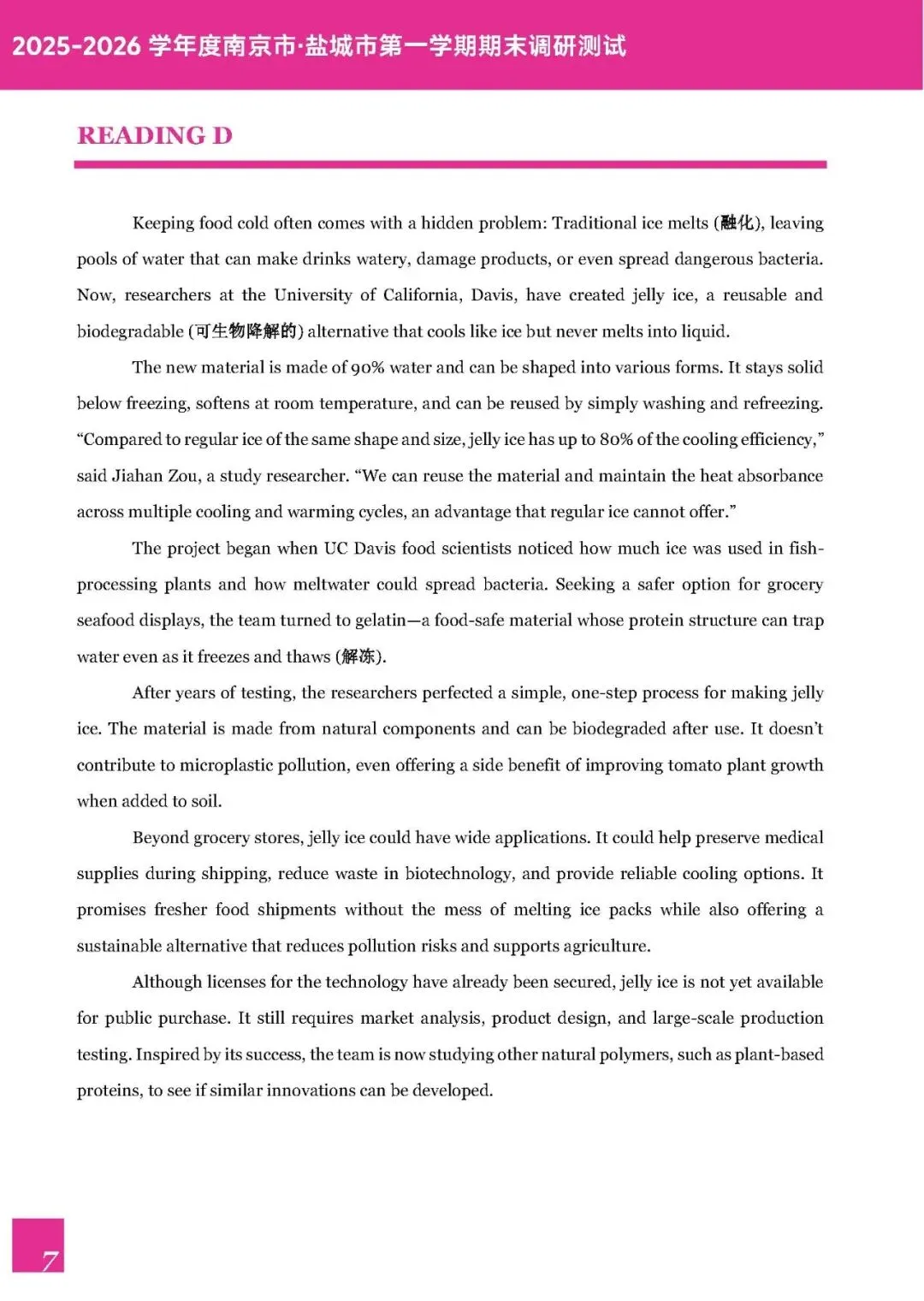 新旧东西类说明文——新东西能够解决原有事物的不能解决问题或者改进旧事物存在的缺陷问题,大概率新的东西不会马上投入使用,意义上有价值,但是在其他方面可能存在缺陷;在以后还可能继续优化、改进且与旧的要共存一段时间。Now, researchers at the University of California, Davis, have created jelly ice, a reusable and biodegradable (可生物降解的) alternative that cools like ice but never melts into liquid.