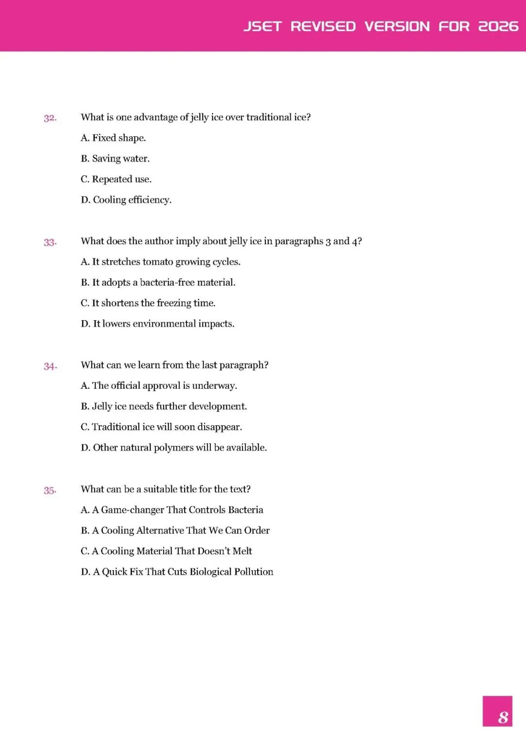 34. B 细节题。如果掌握住新旧东西类说明文的特点,这题可以基本锁定答案。Although licenses for ..., jelly ice is not yet available...