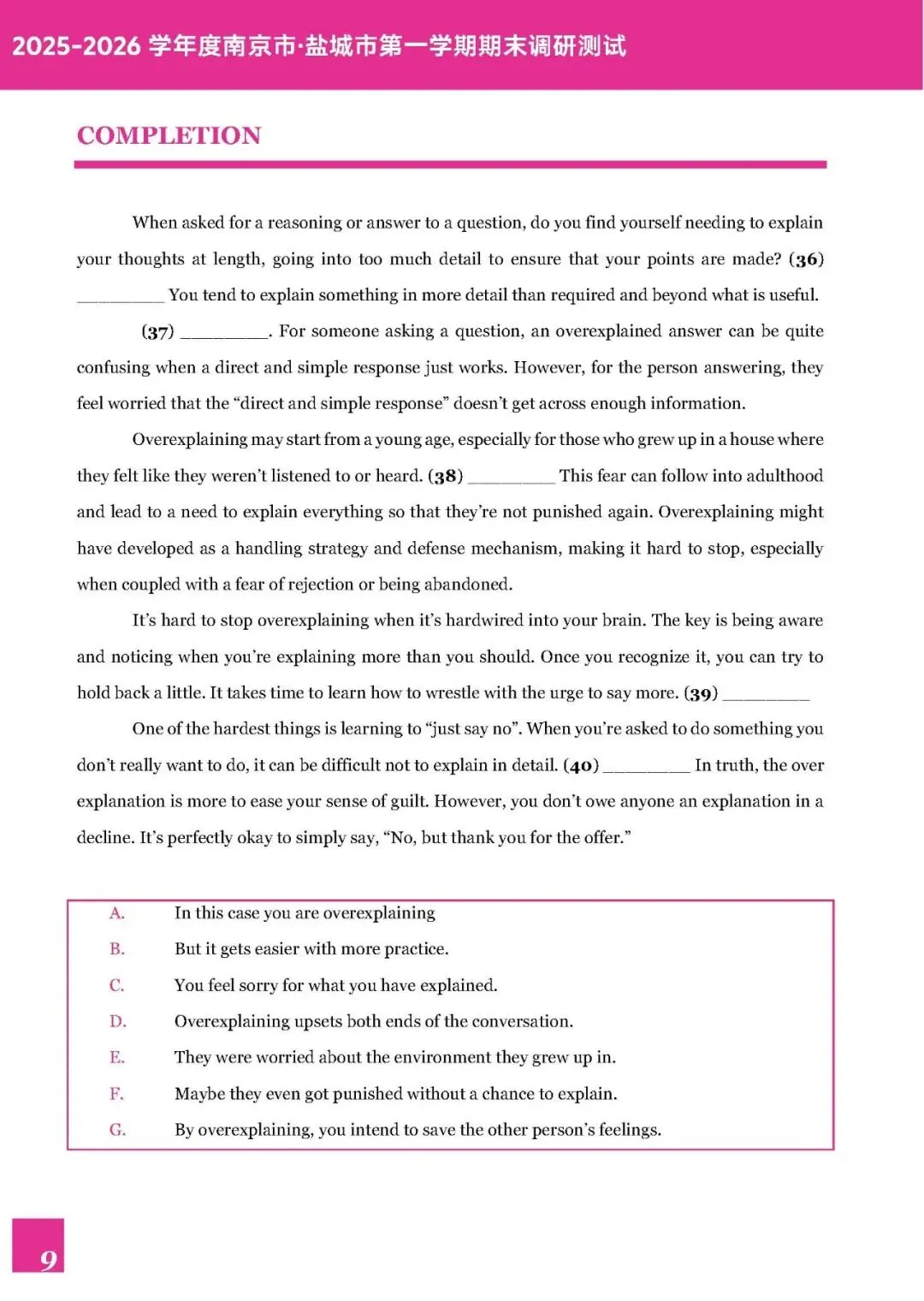 38. F 解题思路:空格后出现代词指代情况:This fear ... 情感色彩上负面表述,备选选项:EF;且两个选项时间上都是过去,也符合空格前句子中出现的过去时间。E选项担忧环境并非是恐惧,而是对尚未发生且可能变坏的事的一种情绪反应,表面和前面对称,但是代指不合理,排除;答案F选项——代指指代前文those,前文they不被聆听与F选项没机会解释就受罚形成正确递进逻辑。39. B 解题逻辑:空格前句 It takes time to learn how to.... 学者如何去……需要时间,改变提高要花时间,不是短时间内就能做到的,表达了难度以及时间上的跨度;文章到这里末尾的位置,要针对前面提出的问题给出改进的建议,B选项一个转折之后——但是练习多了就容易多了。形成完美逻辑衔接:虽然需要时间,但是多练习就能做到。40. G 解题思路:跟句前后的句子人称再次出现you&your,因此再次出现类似36空格的情况,备选选项:CG。空格前句:it can be difficult not to explain in detail. 很难不去详细解释——不得不/被迫要详细解释空格后句:In truth, the over explanation is more to ease your sense of guilt. 事实上的逻辑,本句要与空格内容相反——实际上,缓解你的感受,那转折之前,表面上,缓解别人感受,有这个方向表达的只有G选项。