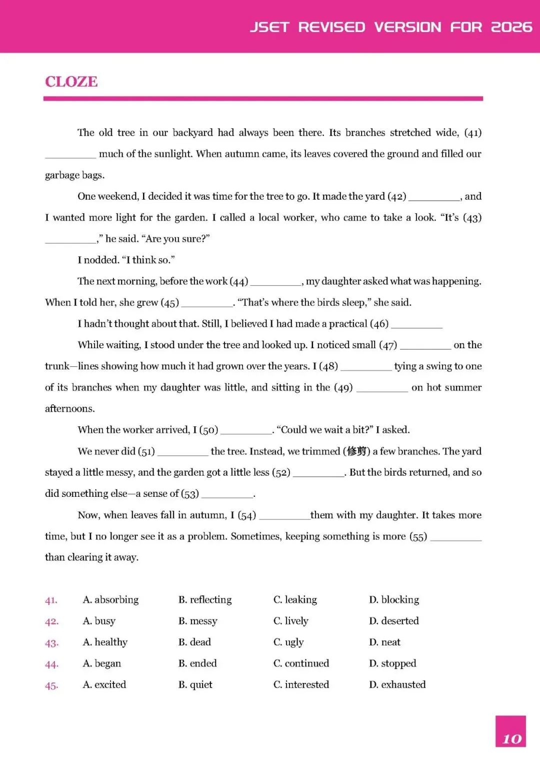 42. B 考察形容词。注意感情色彩,前面提了到秋天满地落叶,收拾起来比较麻烦,已经出现明显负面色彩,本空仍然继续,满地落叶让院子自然是凌乱,答案B选项;C选项态度不对;A选项院子修饰不对;D选项废弃太夸张,有点过了。43. A 考察名词。作者叫来伐木工要砍掉,工人问作者是否确定——说明老树的状态很好,向作者确定一下是不是真的要砍倒,状态好对应A选项。本空没难度。