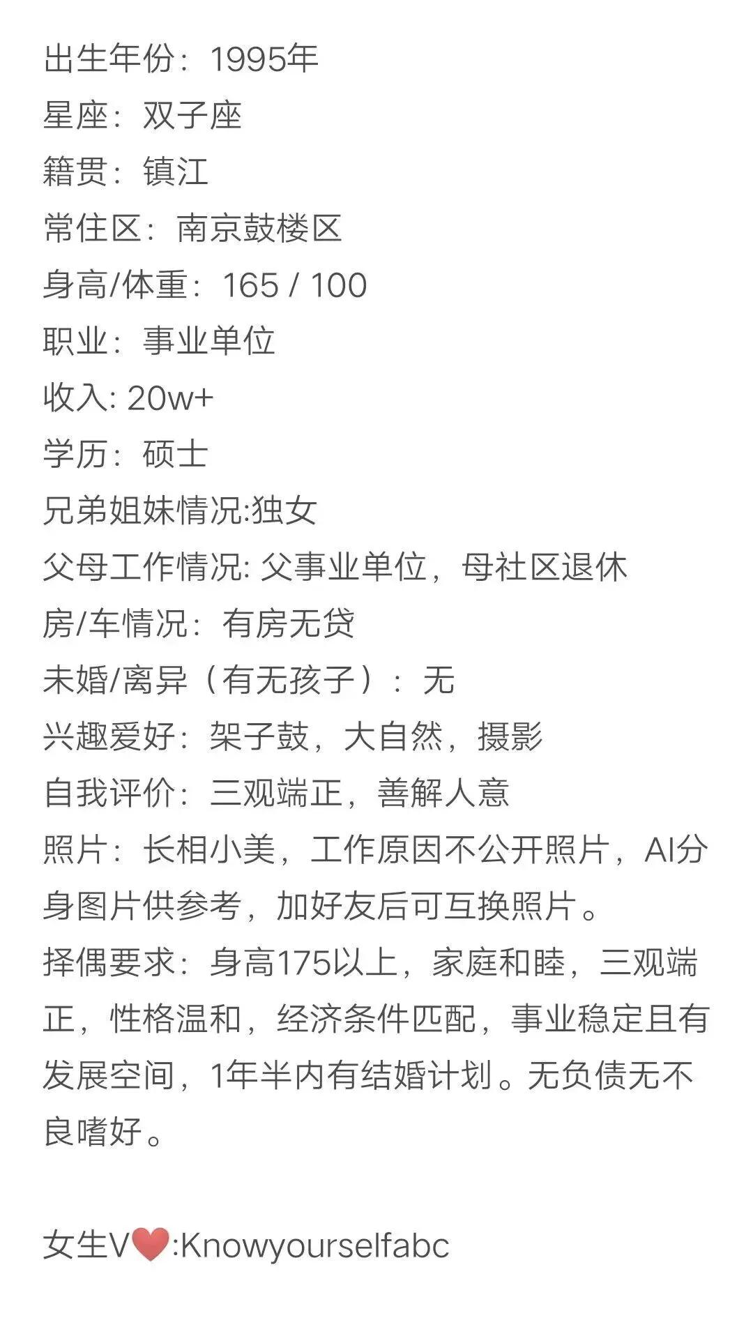 ⑤、【南京月老爷爷牵线(4866)】女,92年,身高162,目前单身,有房,南京浦口人,想找个有独立婚房、年入不低于18万的男友。