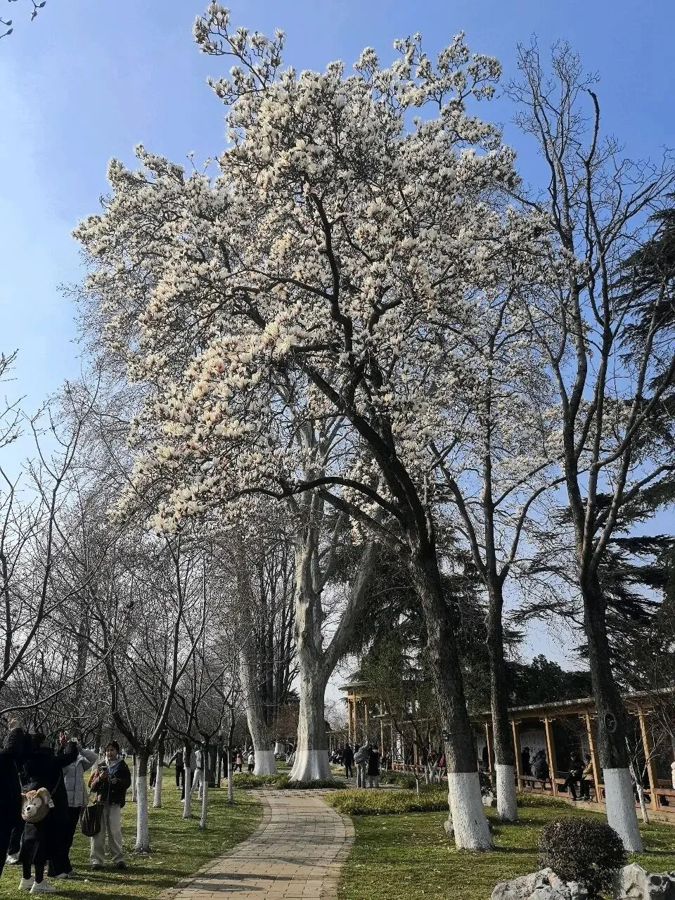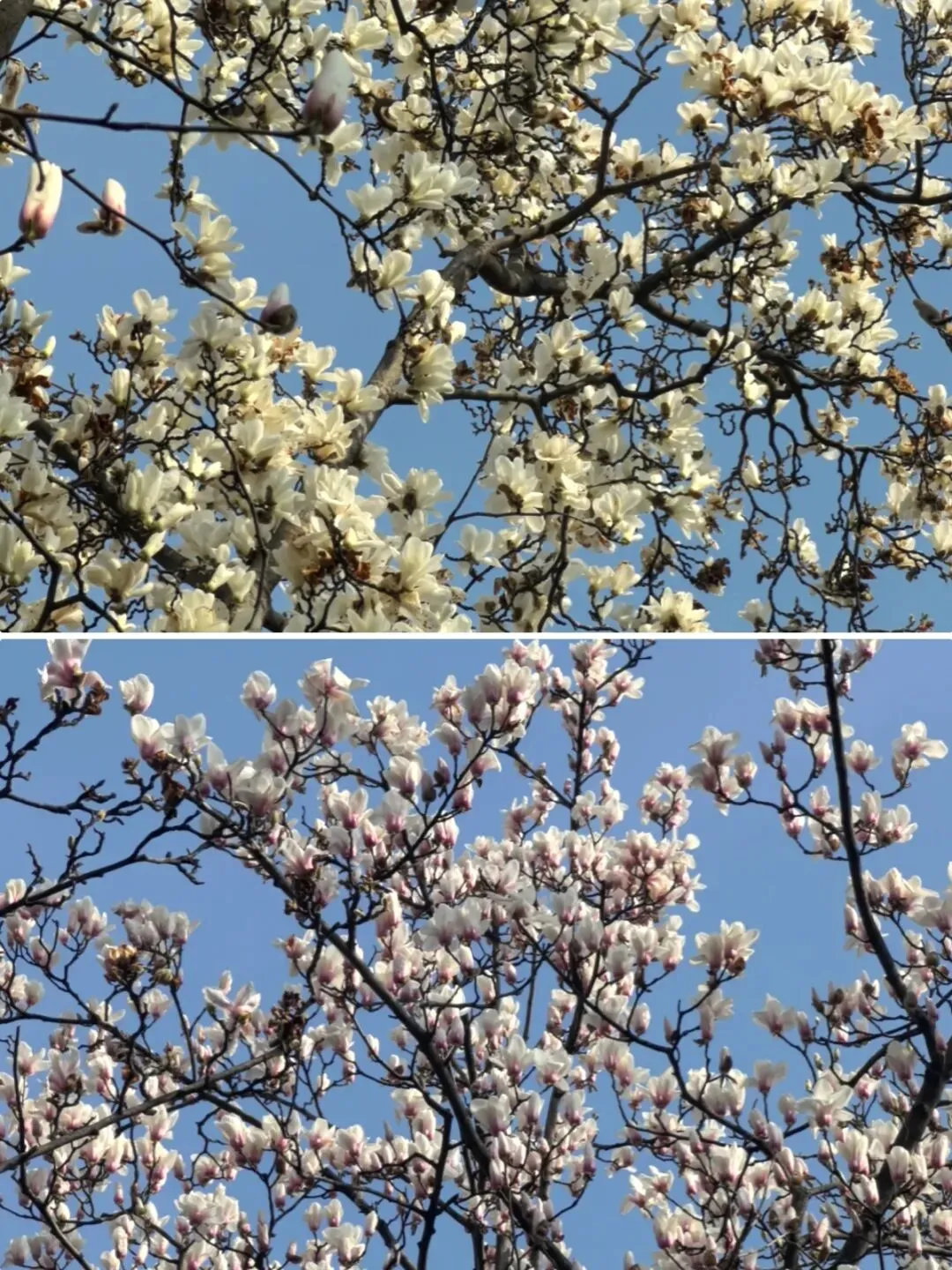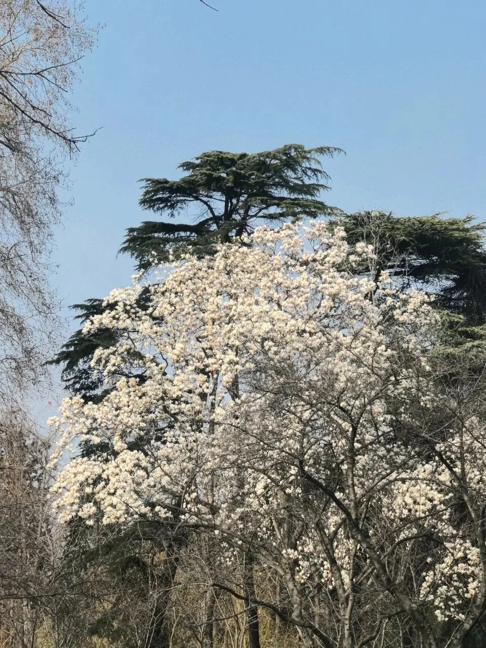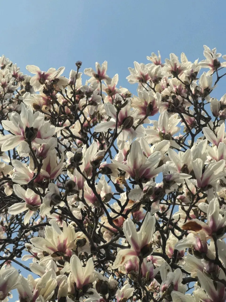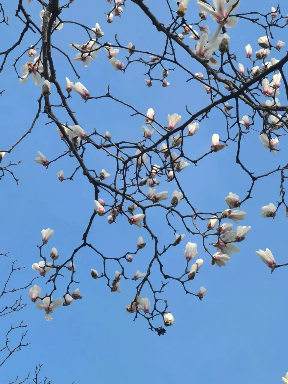 樱洲的玉兰,是这个春天被低估的浪漫。高大的花树远远便能望见,洁白花朵在春风中轻轻摇曳,如翩翩起舞。弯曲的枝桠映着蓝天,勾勒出一幅绝美的工笔丹青。
