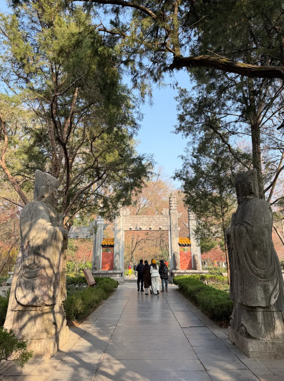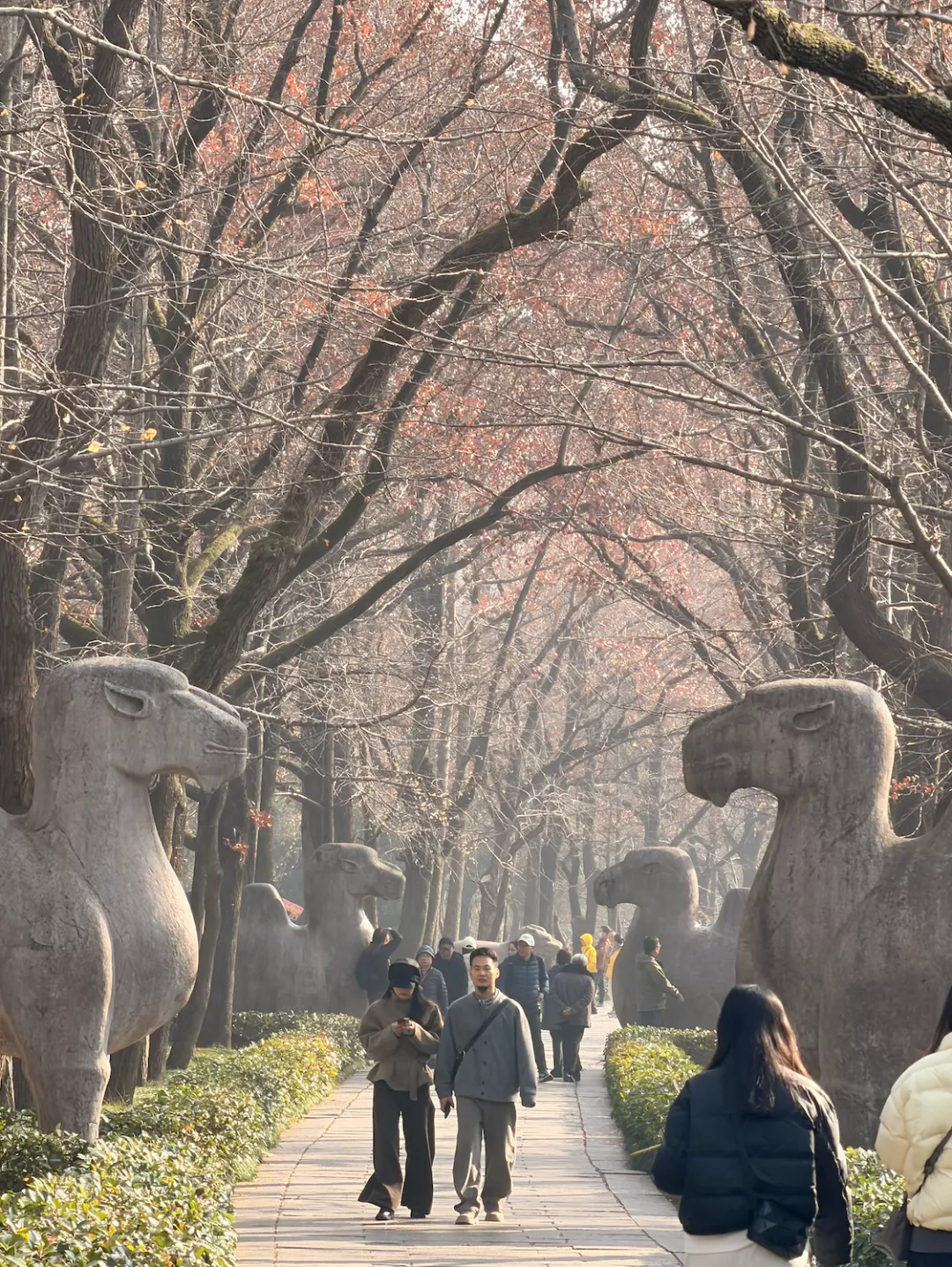 “重头戏”一定是明孝陵最美600米神道!过四方城就到石像路了,狮子、大象、骆驼、马、獬豸等六种神兽,每对两两分立神道两侧,外加路两侧相得益彰的树景,人走在神道上,实在是惬意。