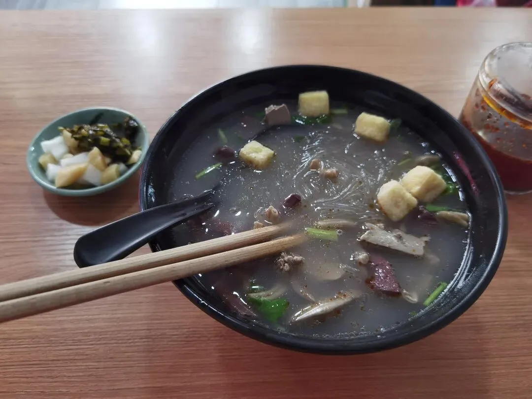 中午没吃饭,早晨多煮的一个鸡蛋忘记拿了。三点多要参加一个在线谈判,在办理入住酒店之前,先先一个地方吃了一碗鸭血粉丝汤。