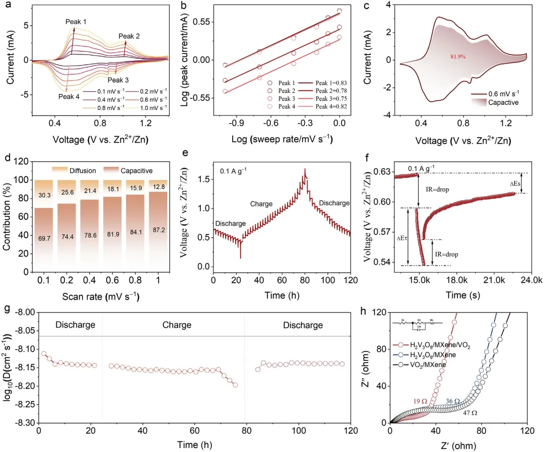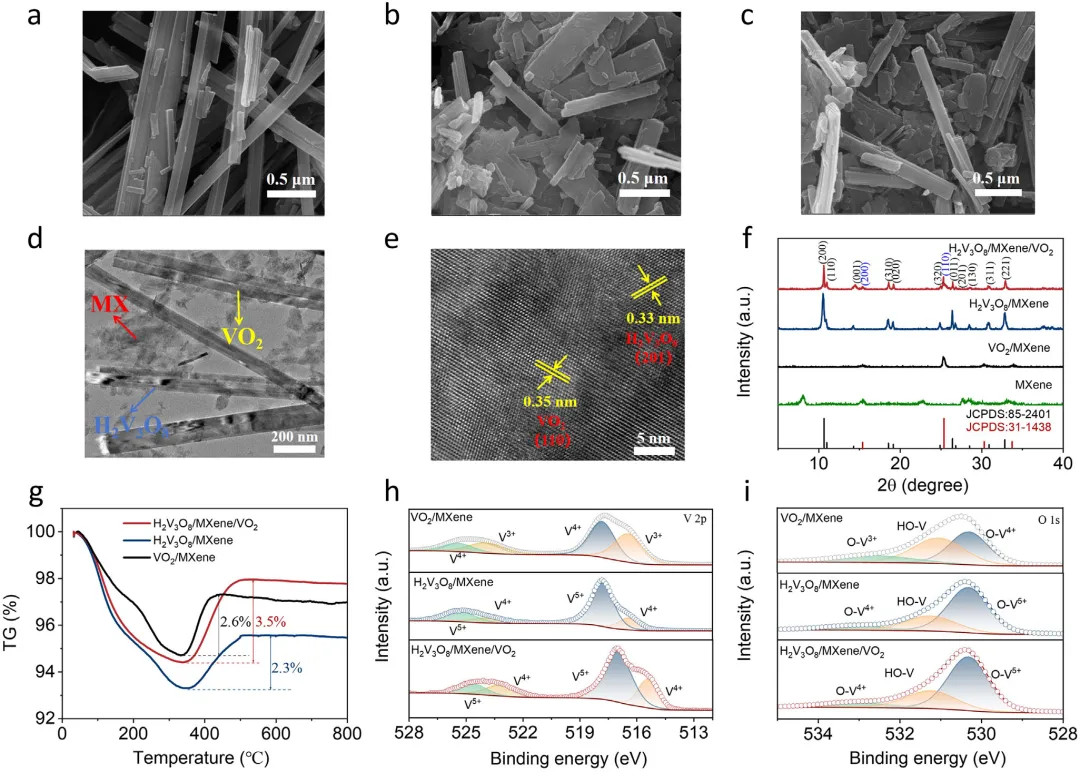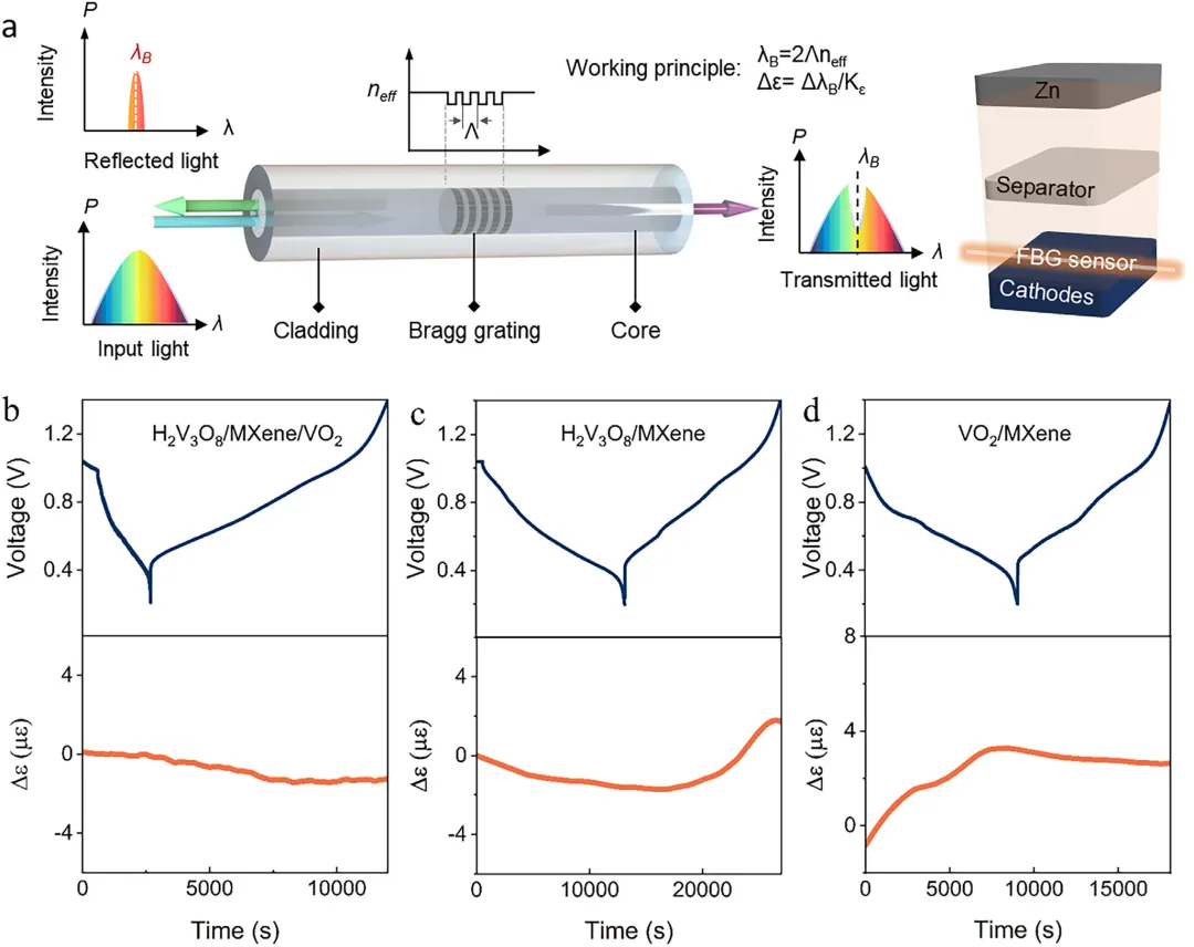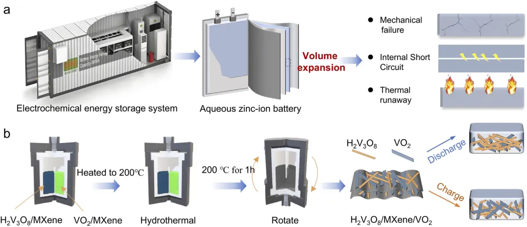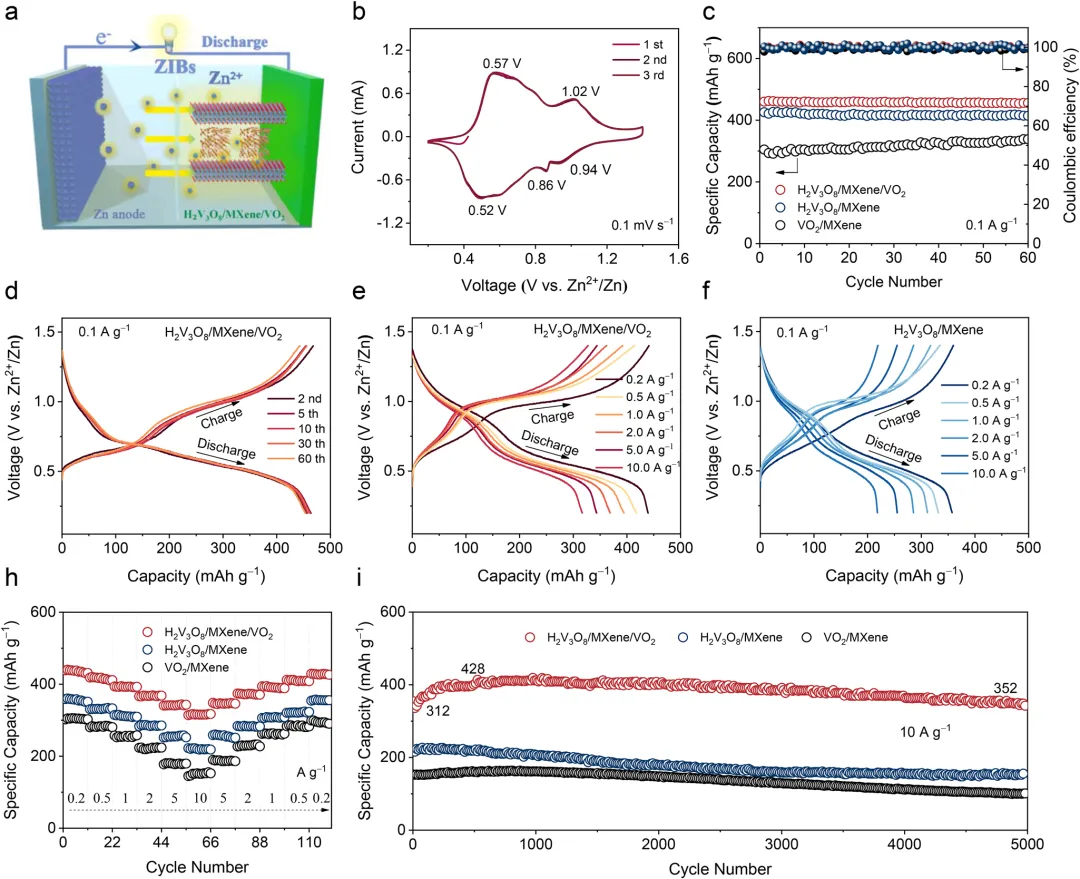 水系锌离子电池因其本征安全性和低成本,在电化学储能领域获得了广泛关注。然而,Zn²⁺嵌入/脱出过程中显著的体积变化仍是限制其应用的主要障碍。2026年3月10日,南京航空航天大学朱孔军、东南大学刘鹏程、湖州学院梁彭花在国际知名期刊Advanced Functional Materials发表题为《Achieving Near‑Zero‑Strain via Volumetric Neutralization in an H₂V₃O₈/MXene/VO₂ Cathode for Durable Zinc‑Ion Batteries》的研究论文,Dingwei Ji、Jun Guo为论文共同第一作者,朱孔军、刘鹏程、梁彭花为论文共同通讯作者。作者得到了通过结合具有相反膨胀系数的材料实现近零热膨胀的启发,将两种在循环过程中表现出相反体积变化的材料集成在一起,以在电池系统内实现体积中和效应。原位X射线衍射证实了H₂V₃O₈/Ti₃C₂Tₓ MXene/VO₂复合材料稳定的体积行为。该复合电极展现出优异的电化学性能,包括在0.1 A g⁻¹下457 mAh g⁻¹的放电比容量、在10 A g⁻¹下428 mAh g⁻¹的最大容量的快速充放电能力,以及在10 A g⁻¹下循环5000次后仍保持352 mAh g⁻¹的长循环稳定性。更重要的是,通过嵌入的光纤传感器进行的实时应变监测直接记录了循环过程中的近零宏观体积变化,验证了协同中和设计的有效性。这些结果表明,体积中和策略是一种缓解结构退化的强大材料设计原则。该研究为开发用于耐用型水系锌离子电池的高性能、结构坚固的正极提供了一条新途径。现代社会发展中,传统能源的广泛使用引发了严重的环境问题。为应对这些关切,世界各国已开始推进新技术的发展。在这些努力中,开发廉价、高度安全且长寿命的电化学储能系统已成为核心。与锂离子电池相比,水系锌离子电池(AZIBs)因其锌资源丰富、成本低廉以及与水系电解质兼容所带来的更高安全性而成为一个主要的研究方向。迄今为止,锰基氧化物、普鲁士蓝类似物和钒基氧化物已被研究作为AZIBs的正极。然而,锰基氧化物的倍率性能差以及普鲁士蓝类似物的理论比容量有限,制约了AZIBs的电化学性能。钒基氧化物,包括VO₂、V₂O₅、V₆O₁₃和H₂V₃O₈,由于其开放的晶体结构和高理论比容量而引起了相当大的兴趣。它们的广泛应用受到循环过程中显著膨胀和收缩的限制。这种体积变化会破坏正极内部的颗粒间接触,增加内部短路的风险,并可能引发热失控,从而损害电池的可靠性。为了减轻正极体积变化带来的后果,研究人员已经开发了诸如层间距工程、形貌控制和缺陷调控等策略。例如,Yao等人通过构建MoS₂-CTAB超晶格扩大了MoS₂基正极的层间距,从而减少了循环过程中的体积波动。Wang等人通过添加乙二醇将VS₂的形貌从堆叠片状修饰为纳米花,利用形貌稳定性来抑制正极体积变化。Luo等人通过使用金属离子嵌入能,在尖晶石结构的ZnMn₂O₄中制造缺陷并扩大晶格间距,从而在充放电过程中稳定了体积行为。在航空航天系统中,用于导航和激光通信的材料需要近零热膨胀以保持尺寸稳定性。研究人员通过将具有正热膨胀系数的金属与具有负热膨胀系数的陶瓷(例如ZrW₂O₈)相结合来实现这一点。通过仔细的成分设计,这些组分在温度波动期间的尺寸变化相互抵消,从而保持了结构完整性。受此补偿概念的启发,作者确定H₂V₃O₈是一种在锌离子嵌入期间表现出层间收缩的钒氧化物。这种行为源于带正电的锌离子与阴离子V₃O₈层之间的强静电吸引力。这种层状结构和主导的库仑相互作用的综合效应导致放电期间层间距减小。其他钒氧化物,包括V₂O₅、V₆O₁₃和VO₂,在锌离子嵌入时表现出膨胀。鉴于这些材料截然不同的结构演变,作者提出,将具有相反体积变化的组分集成到一个复合正极中可以稳定整体框架并抑制有害的尺寸波动。值得注意的是,一篇近期发表的文章也提到了VO₂和V₂O₅中的体积应变补偿机制。然而,其核心策略在于通过热氧化相工程构建VSSe/VO₂/V₂O₅三相异质结,利用不对称界面诱导的自旋极化效应和多阴离子氧化还原协同机制来实现高正极性能,其根本核心重点与该研究有所不同。在本研究中,H₂V₃O₈/MXene/VO₂复合材料是使用一步高温水热法合成的。除非另有说明,术语H₂V₃O₈/MXene/VO₂指的是在200°C下由0.1克H₂V₃O₈/MXene和0.1克VO₂/MXene制备的样品。为了验证该路线的优势,还制备了具有相似组成的物理混合样品(记为H₂V₃O₈/MXene/VO₂-PM)。一步水热法促进了前驱体的完全溶解,并促进了原子尺度的有序结晶。由于这种复合设计,正极表现出高比容量、强循环稳定性和优异的倍率性能。本研究表明,将两种在循环过程中具有相反体积变化的材料集成在一起,是解决AZIBs正极体积变化问题的有效策略,并支持高性能AZIBs的开发。图1:研究背景、结构与机理示意图。(a) 电池循环过程中体积变化引起的有害效应示意图。(b) H₂V₃O₈/MXene/VO₂复合材料的合成示意图及充放电过程中的体积变化机理。图2:材料表征。(a–c) H₂V₃O₈/MXene、VO₂/MXene和H₂V₃O₈/MXene/VO₂复合材料的场发射扫描电子显微镜(FE-SEM)图像。(d–e) H₂V₃O₈/MXene/VO₂复合材料的透射电子显微镜(TEM)和高分辨透射电子显微镜(HR-TEM)图像。(f) X射线粉末衍射(XRD)图谱。(g) 热重曲线。(h–i) V和O的X射线光电子能谱(XPS)。图3:原位XRD图谱。(a) H₂V₃O₈/MXene, (b) VO₂/MXene, 和 (c) H₂V₃O₈/MXene/VO₂复合材料。图4:电化学性能。(a) Zn//H₂V₃O₈/MXene/VO₂