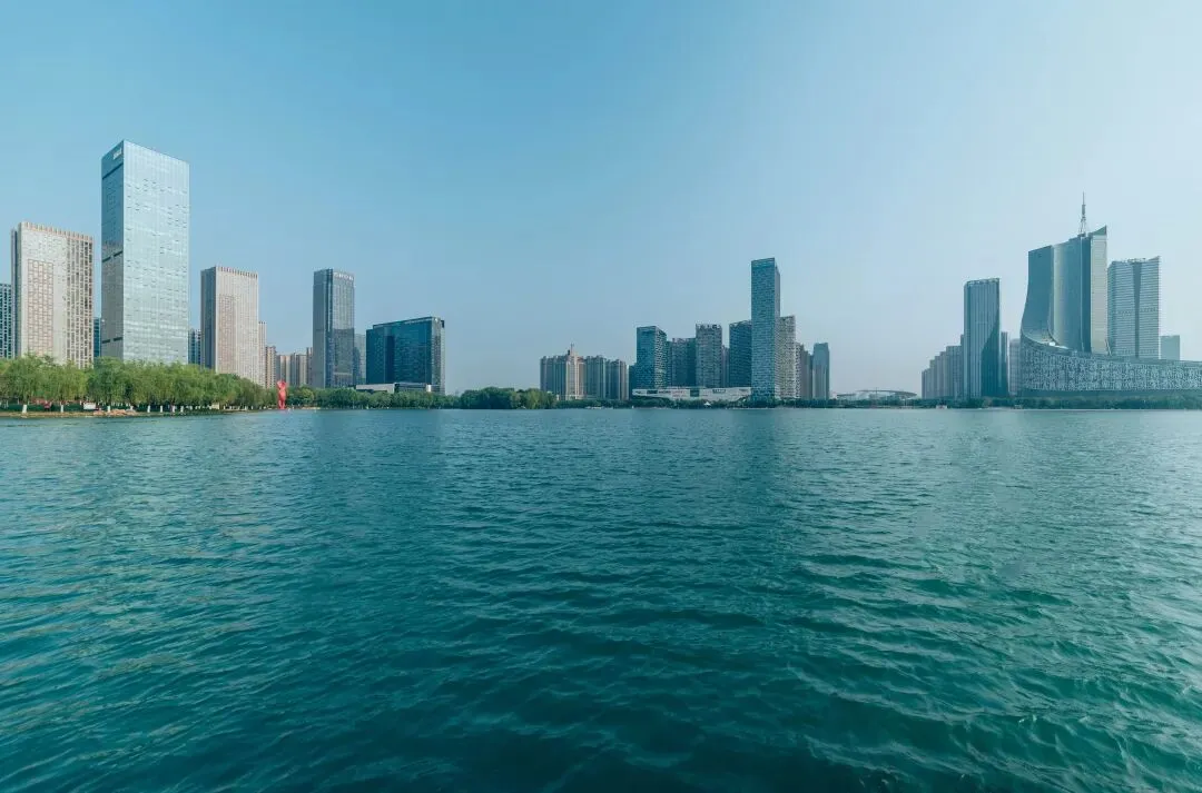 没想到路很好,上了高架快速干道,很快就到天鹅湖。湖不大,周边环绕了高楼大厦,非常有现代感。但下雨,所有的凳子都湿漉漉的,没处坐,周边也没几个人。来到湖侧舞台处,往后看,不远处有两座高楼,像书页刚刚打开,纸张交接处,漏出一条缝隙,有圆顶建筑。我想谁能居于此核心显耀位置?莫非是机关单位。再细看,有国徽。手机看地图,是政务中心。