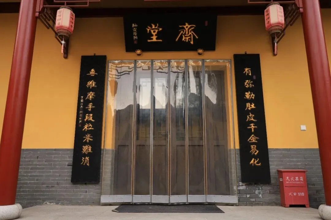 在鹫峰寺中边走边拍照,走到了斋堂门前,门口的一副对联不仅让我眼前一亮,而且心头一震: