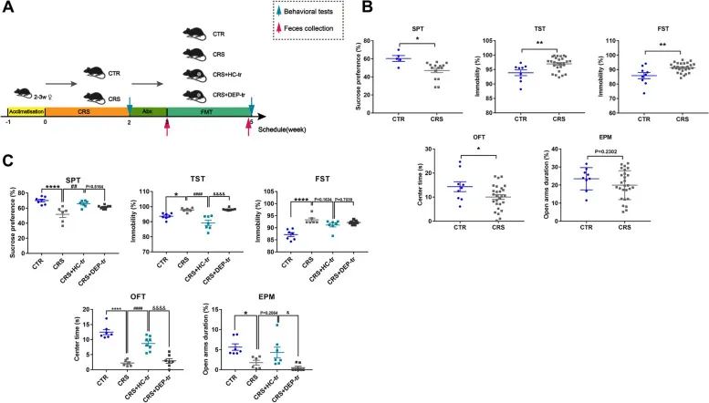 ▲健康志愿者的肠道菌群移植(FMT)改善了小鼠的抑郁状行为。