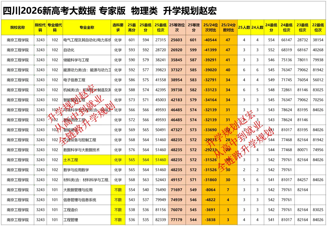 电气是不是这两年最热门的专业,没有之一,不管是高考还是转专业。说到电气专业,大家是不是都想上原电力部直属的大学,尤其是中分段的家庭,高分段有选择权,可以985+电气。往下可就没这么理想。原电力部直属大学,大家会想到行业院校,说到行业院校,那么对应的行业专业才具备优势,非行业专业就那么理想。如果你是高三的家长,回到2025年高考,你会预留多少分?才能够保住电气专业。要是咱们是2026高考的家庭或者2027高考的,这儿先停下来,想一下,我应该预留多少分。我知道大家学了很多方法,也看了很多的技巧,水平还不低,可正是因为你们很懂,反而会出问题。我们这儿把南京工程学院2025年在四川的各个专业分给大家整理出来了,也做数据的等效换算,只有等效换算了,咱们才能去做分数对比,要不就是错的,当然等效换算过来的也是大概位置,不是准确的值。南京工程学院在四川有101组和102组,101组不限选科,102组包含了电气工程及其自动化、能源动力类、土木工程专业。其实看到这儿,大家就知道了,这个专业组不干净。2026年大概率也是这个样子。电气工程及其自动化的最高分是601分,最低分是594分,位次是27315名,等效换算后是25603名,对比2024年的最低位次66147名,位次上涨了40544名,换成等效分是601分,对比2024年的554分,相当于上涨了47分。看到这儿的上涨分数,大家刚刚预留的分数够吗?很多预留20多分30多分,是不是发现,高分依然被调剂了。看看土木工程也涨了30分。看到这儿啊!大家有没有发现,过去的方法和技巧,已经失效了。为啥会失效,因为底层逻辑已经发生改变,大家都在求稳,都在保专业,为了保专业,宁愿浪费分数,也要去保住。这个在以前,大家是不能接受的,咱们孩子辛苦考的分数,是不可能浪费的。其实这一切,我们有个专业名词:填报博弈,其他都是表象,填报博弈才是填报的真正核心。啥叫填报博弈,就是你要预判的你的竞争对手是怎么想的,预判准确了你才能精准填报。填报博弈没搞定,数据就是失真的。这样的院校还有很多,2025年变化大,2026年依然会影响很大,欢迎关注,后面咱们更新更多内容。不信,这儿问大家一个问题,咱们填报看的是3年的数据,比如南京工程学院,这个三年的数据该怎么参考,是看2025年为基准,还是把三年加起来算平均位次。对于咱们想要保专业的家庭,如果你把控不准,可以找我们。