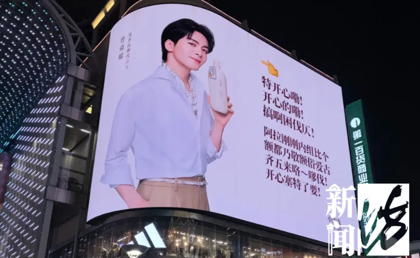 而当记者告诉他们,这则广告的意思,是品牌方最近签约了左边这位大眼睛帅哥,以表达着品牌方的喜悦。