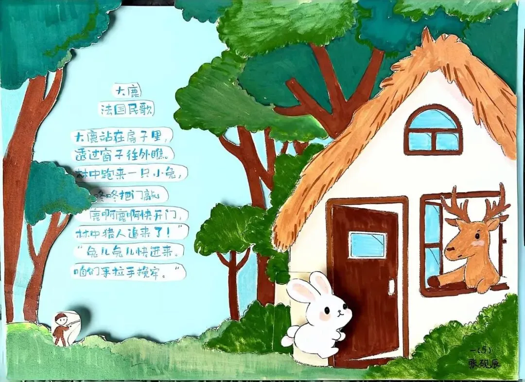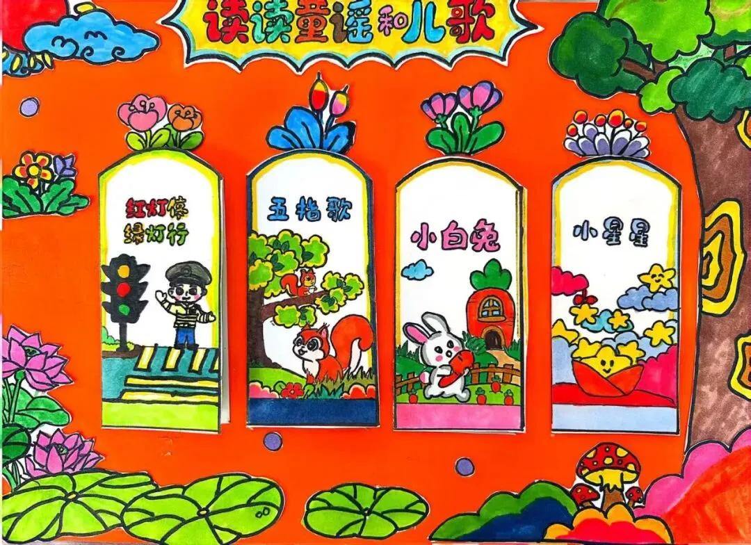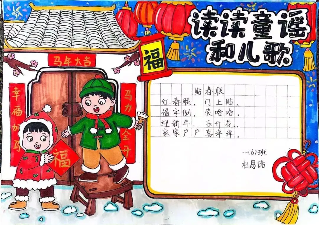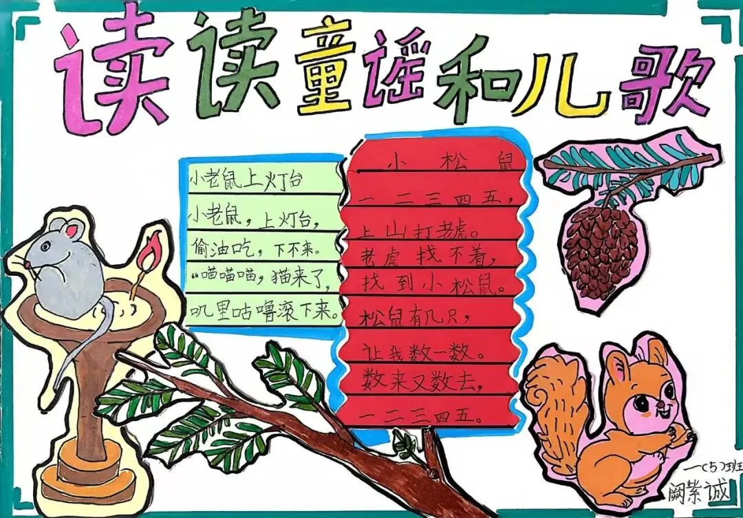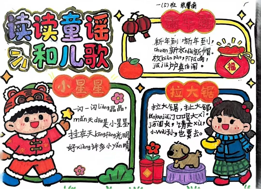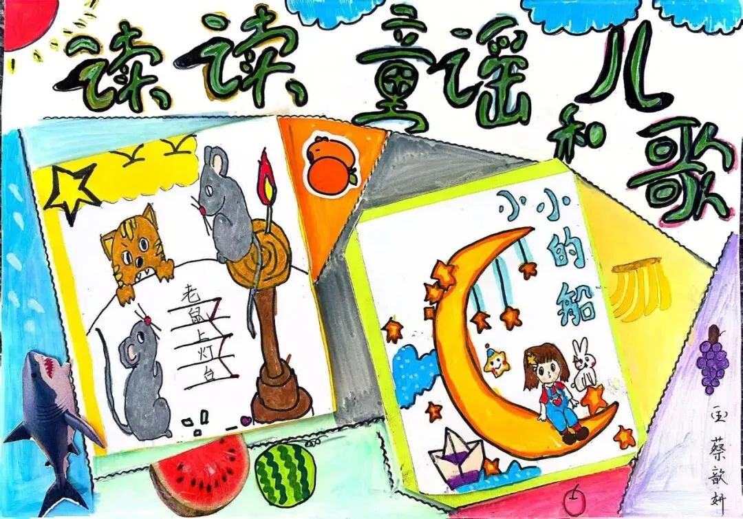 一年级的小同学们以童谣为主题,用稚嫩的画笔勾勒出童谣里的可爱场景,用简单的文字标注出自己的感受,作品里满是对童谣韵律的喜爱,在朗朗上口的词句中感受语言的美好,留下了童年最纯真的印记。