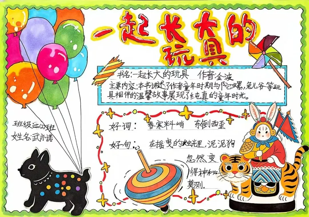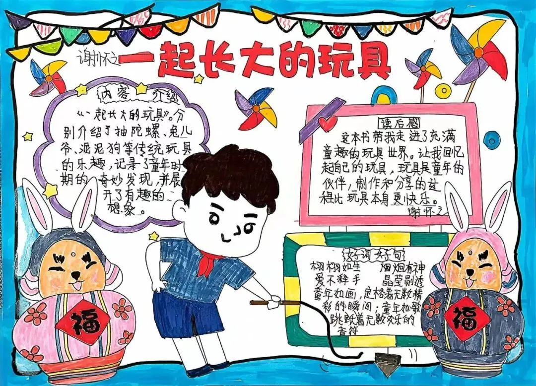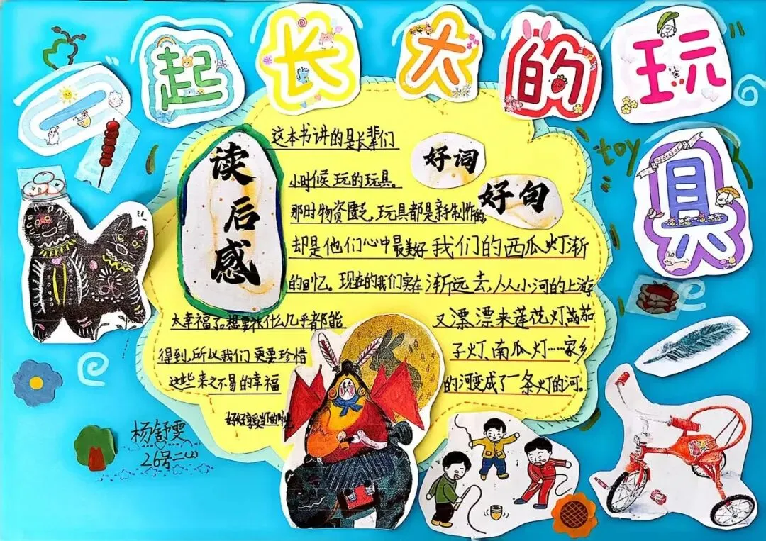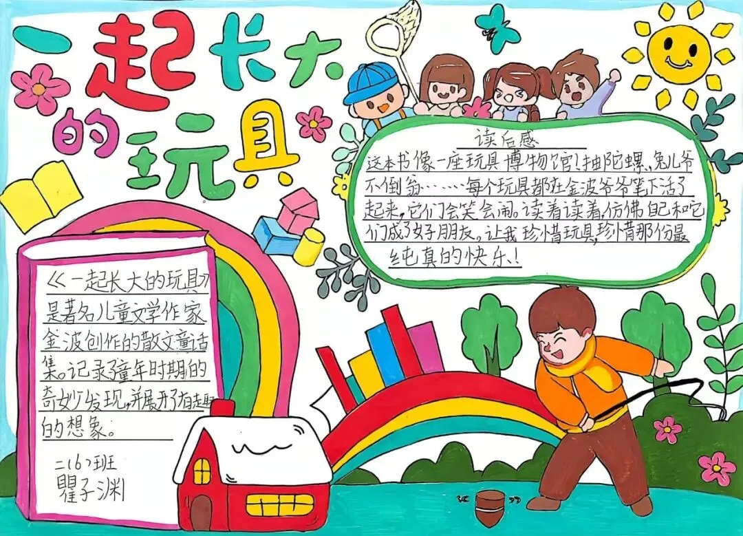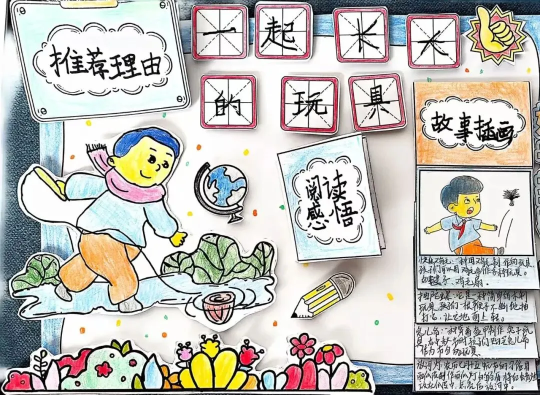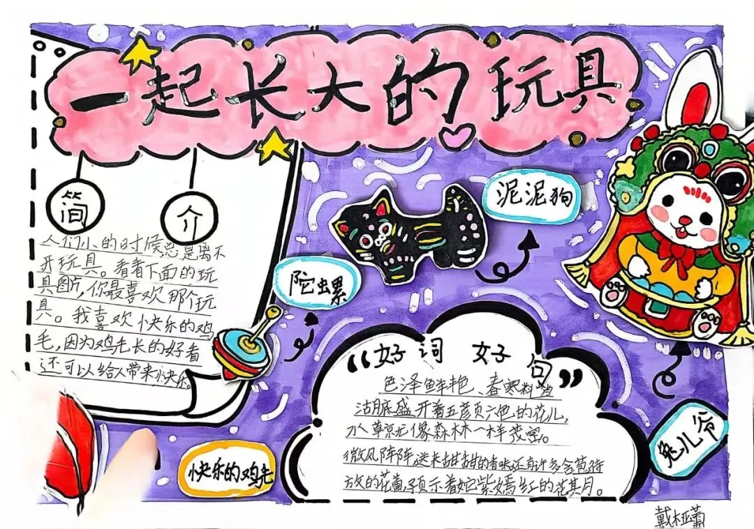 二年级的同学们围绕《一起长大的玩具》展开创作,他们画出了泥泥狗、抽陀螺等充满回忆的玩具形象,用文字分享玩具背后的童年趣事,不仅展现了对玩具的热爱,也传递出在陪伴中慢慢长大的温暖,尽显孩童视角下的纯粹与天真。
