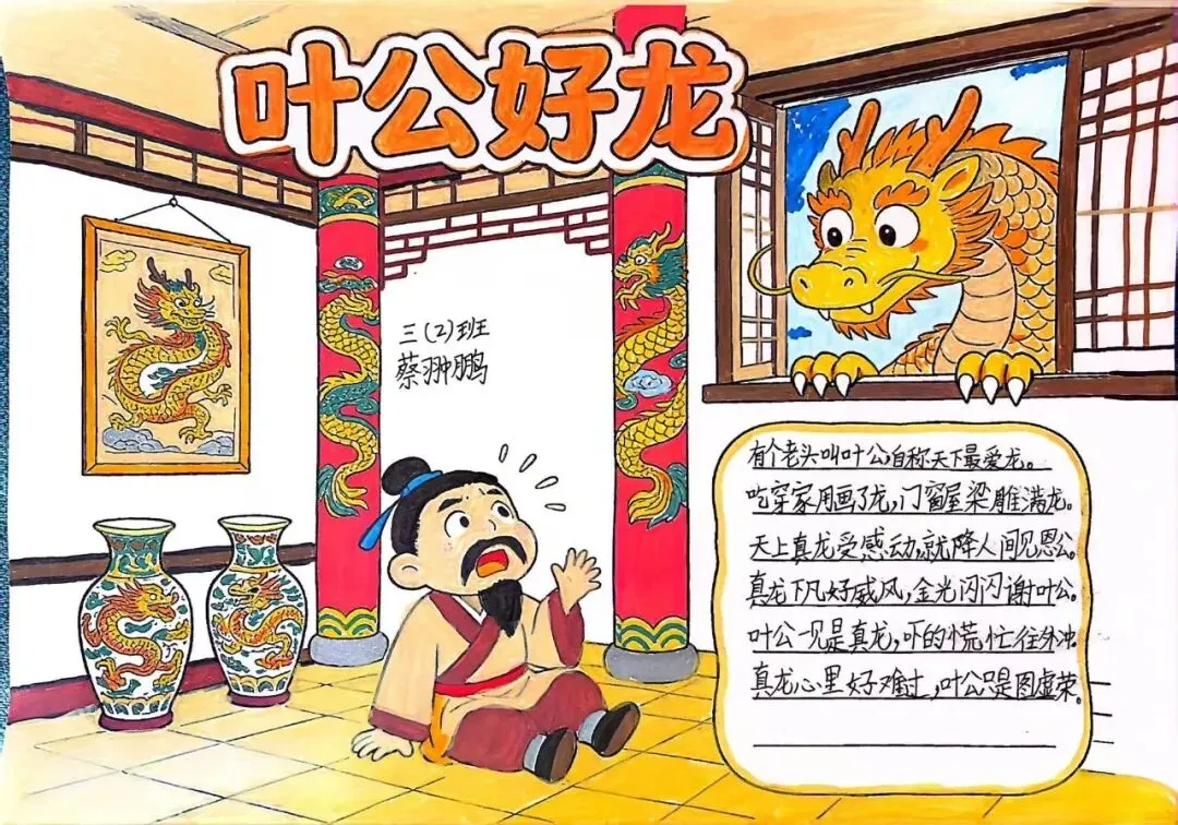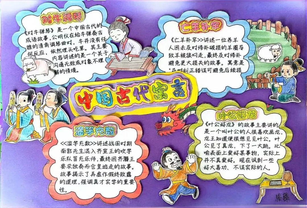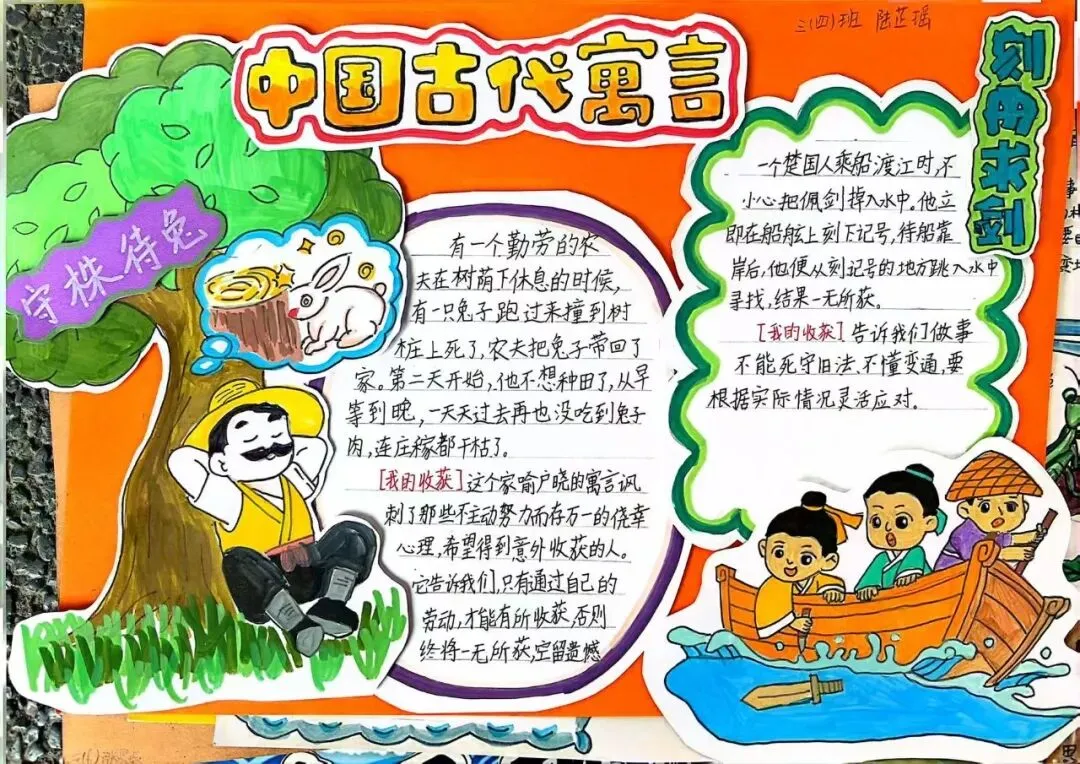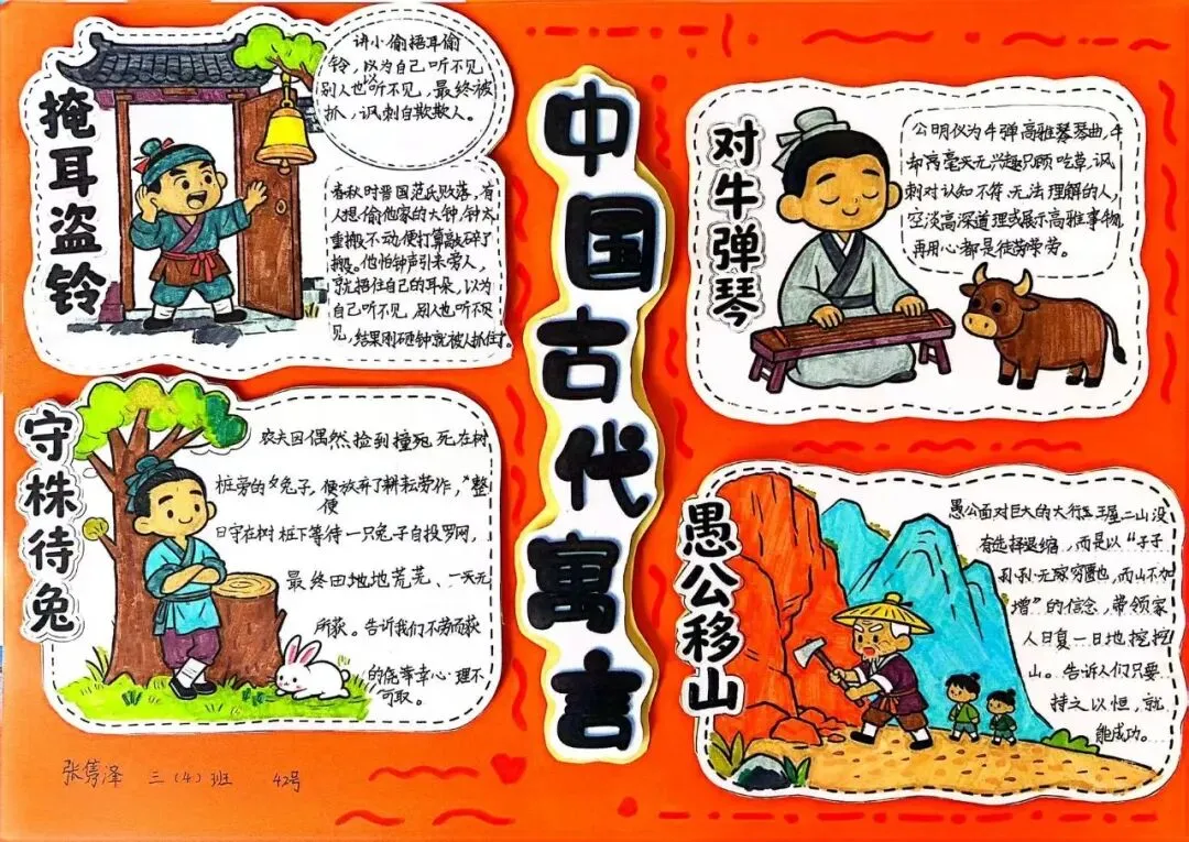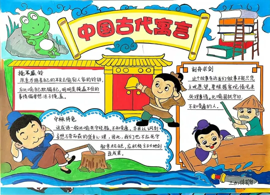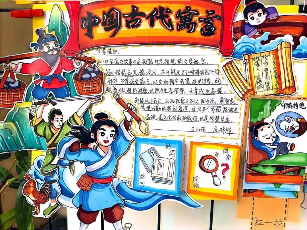 三年级的同学们以《中国古代寓言》为核心,用绘画的形式呈现《守株待兔》《掩耳盗铃》等经典故事,搭配简短的文字解读寓言道理。在图文并茂的小报中,他们不仅读懂了故事,更学会了用智慧看待生活,传承着中华传统文化的哲思。