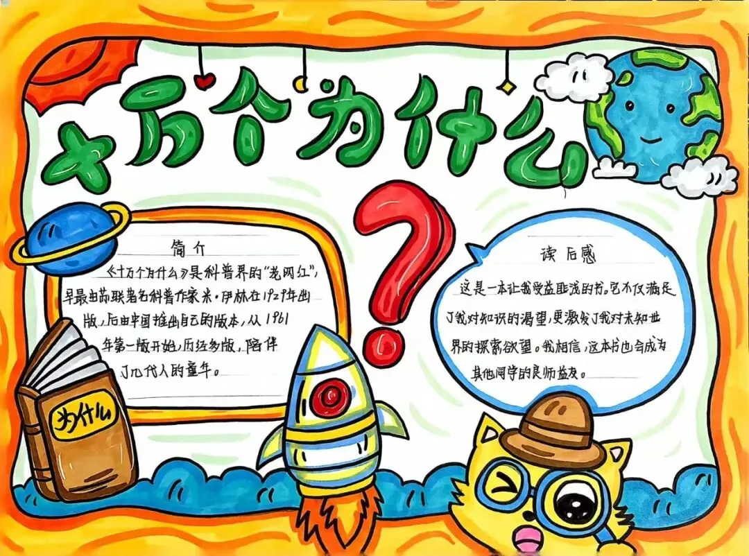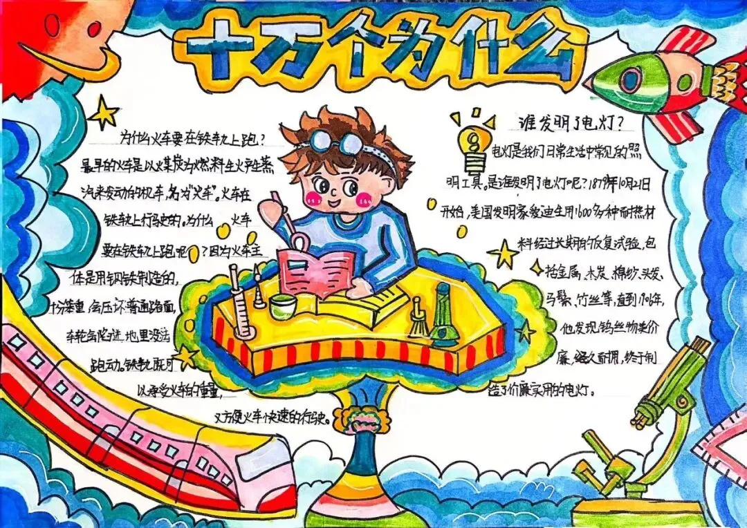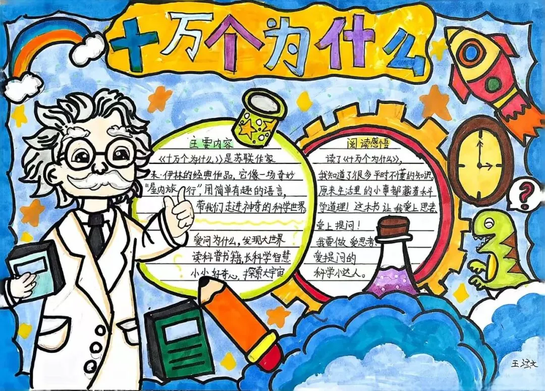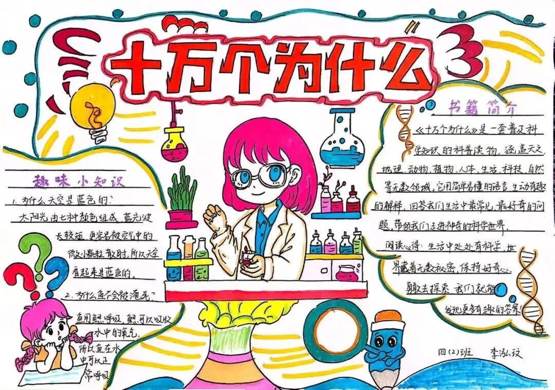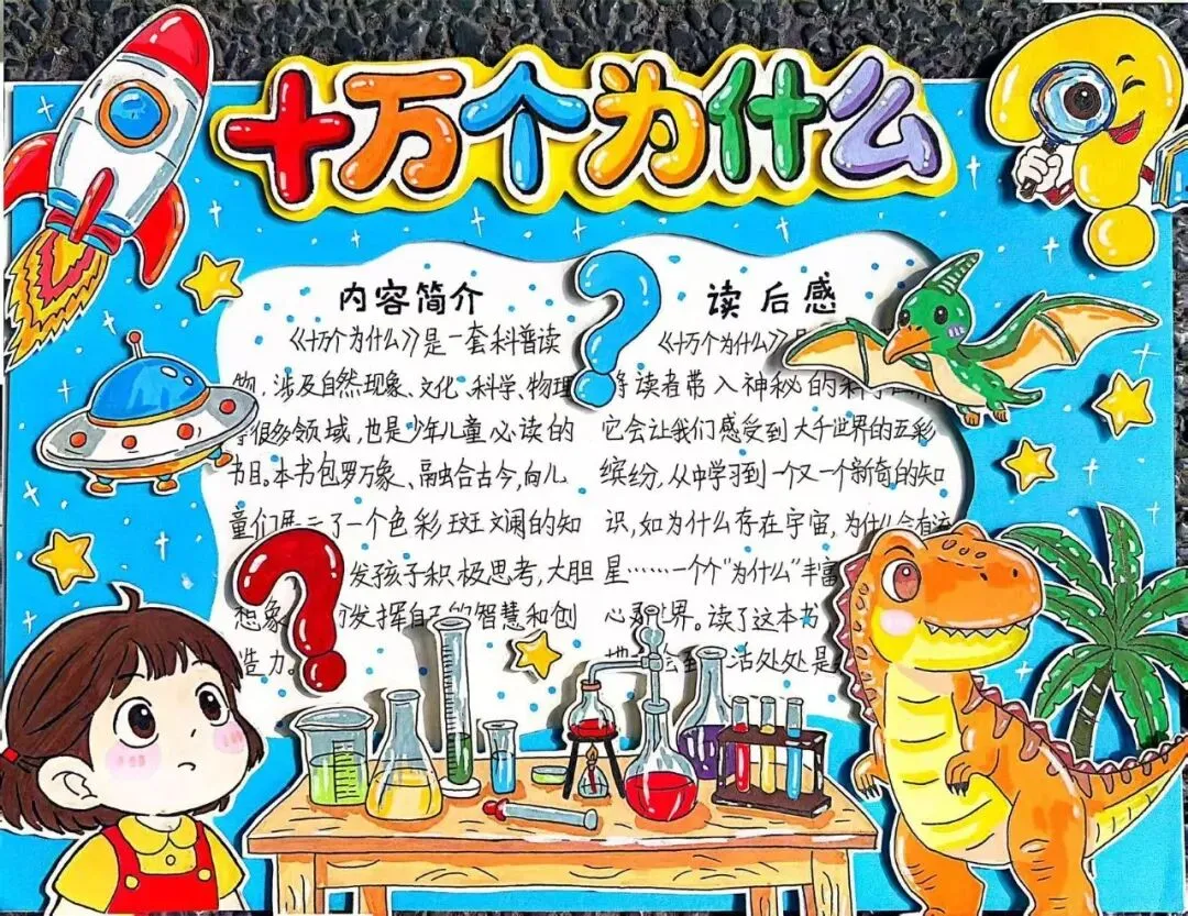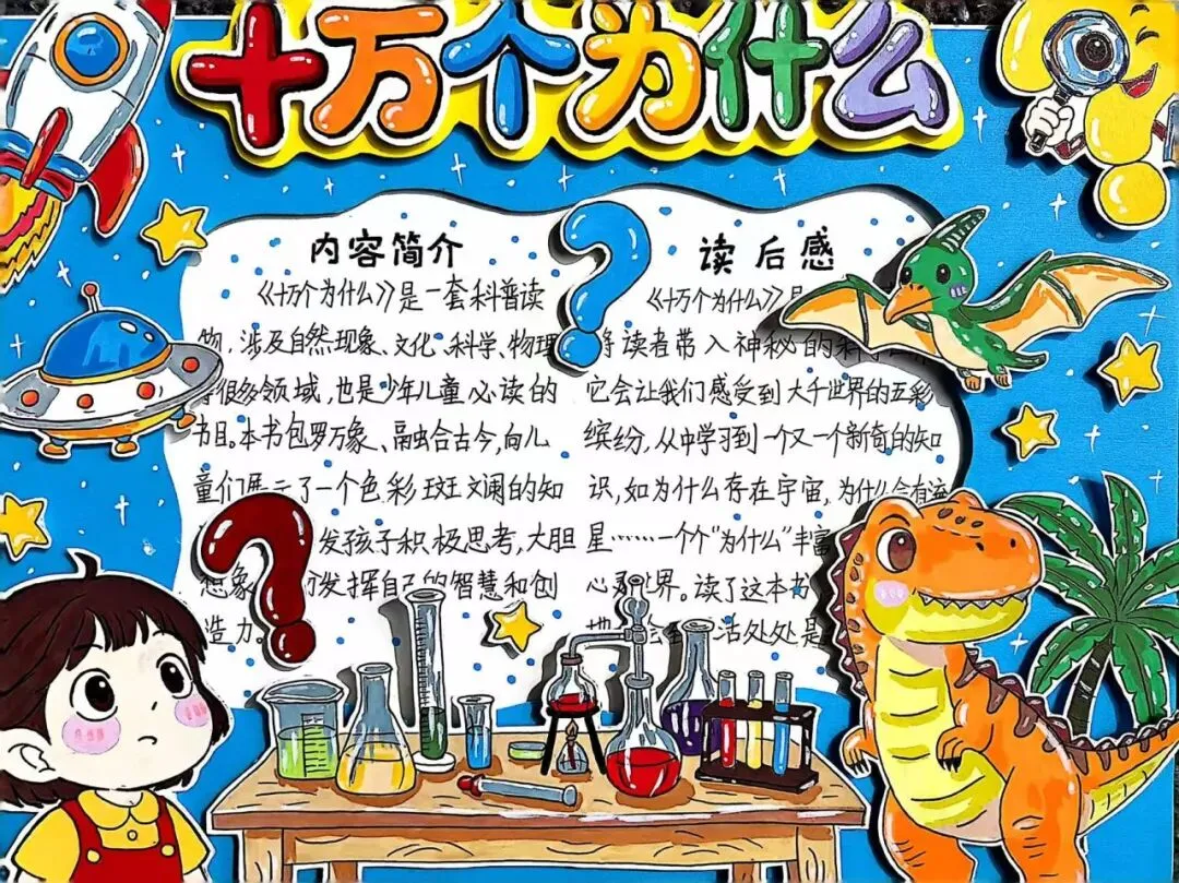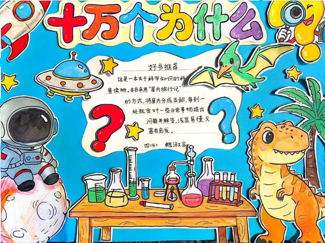 四年级的同学们聚焦《十万个为什么》,用色彩斑斓的图画描绘出宇宙星空、动植物奥秘等科普场景,用简洁的文字解答心中的疑惑,作品里满是对世界的好奇与探索欲,在科普阅读中点亮了科学思维的火花。