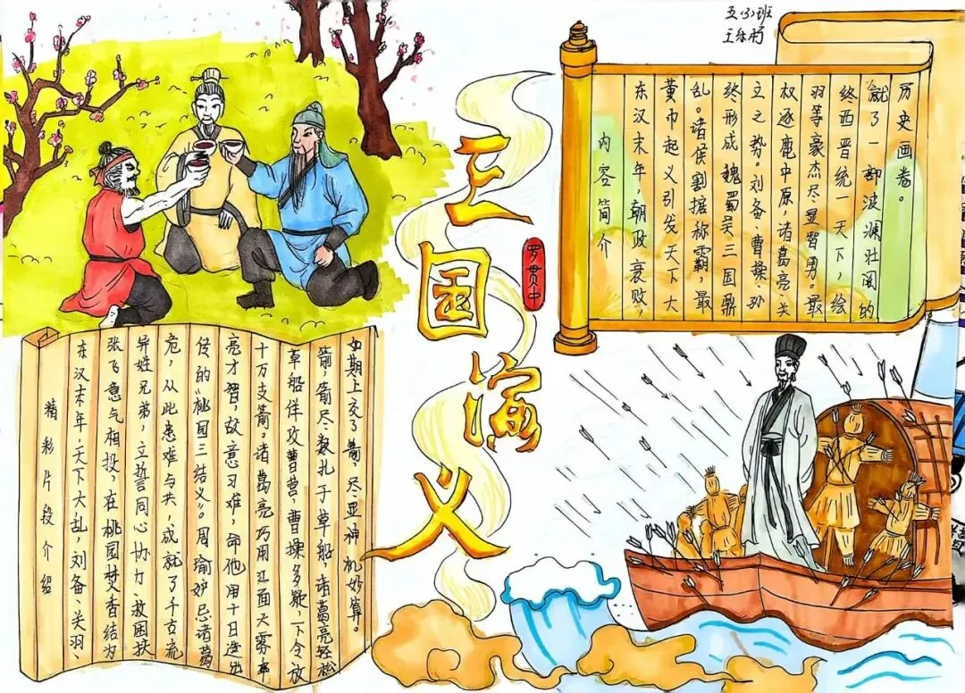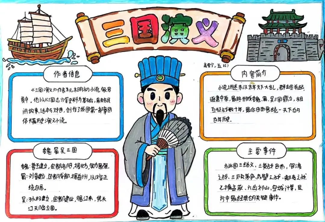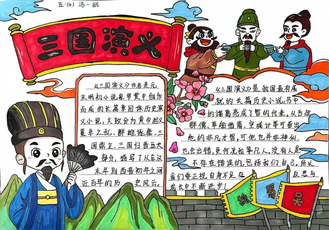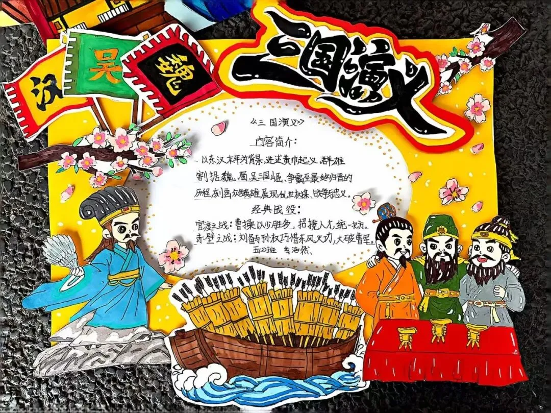 五年级的同学们以《三国演义》为载体,画出了诸葛亮、关羽等经典人物形象,用文字梳理精彩战役与人物故事。在阅读与创作中,他们感受着乱世英雄的豪情与智慧,在历史故事里涵养家国情怀,提升文学素养。