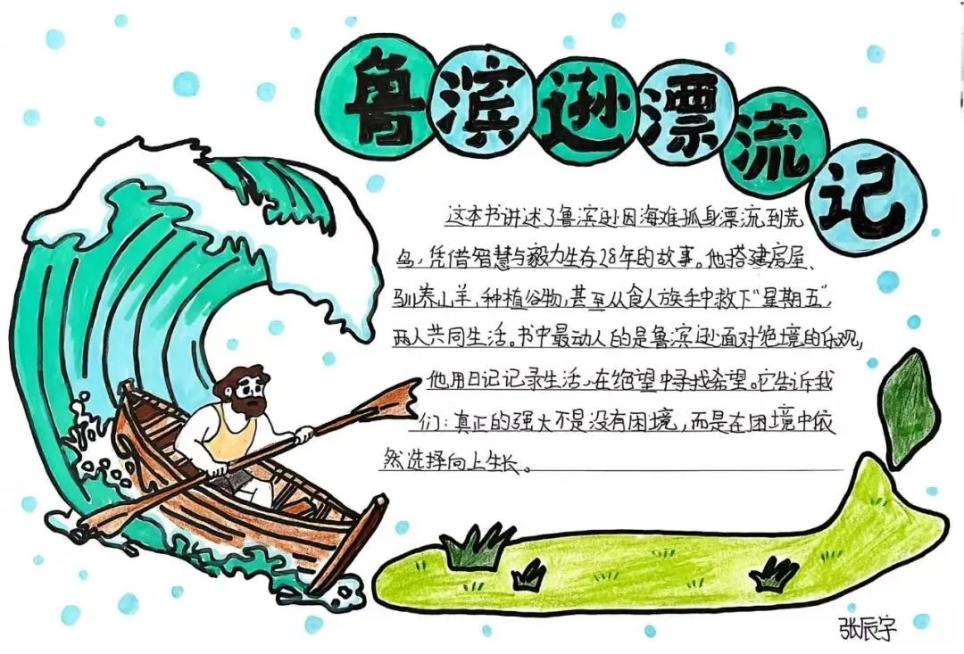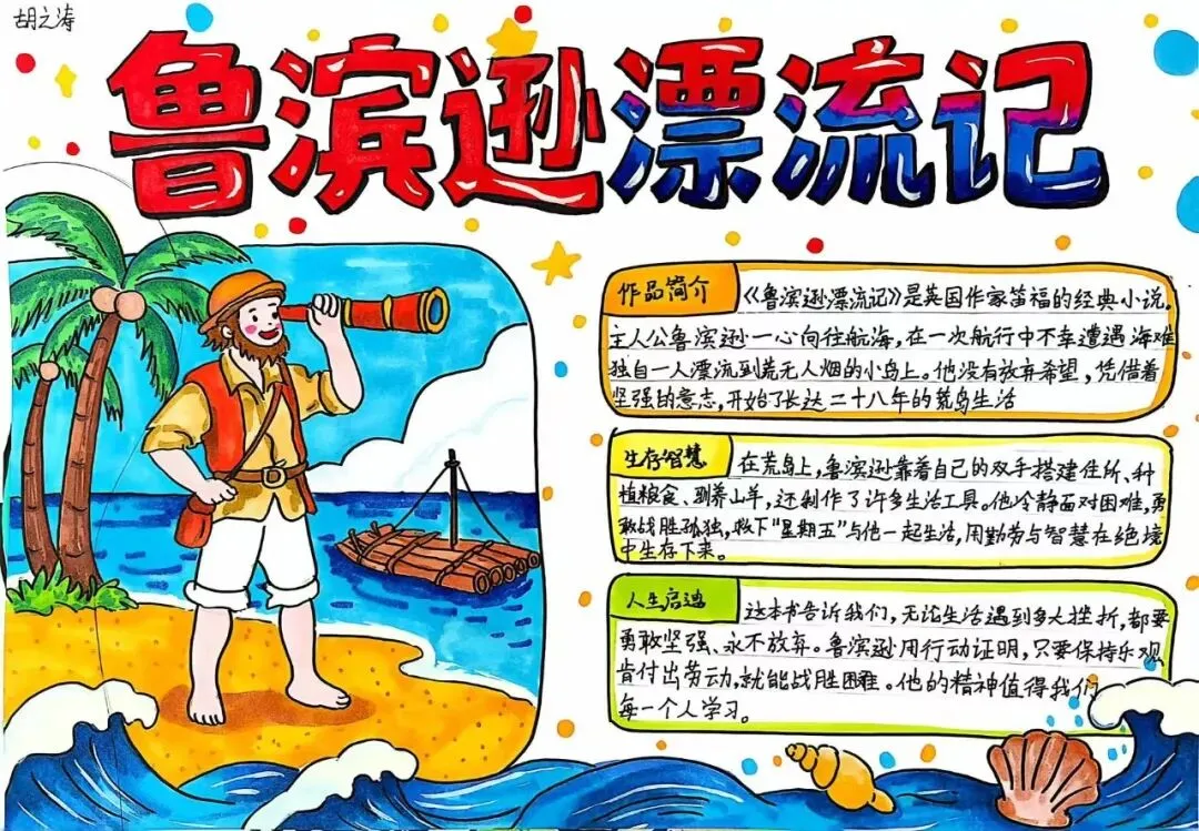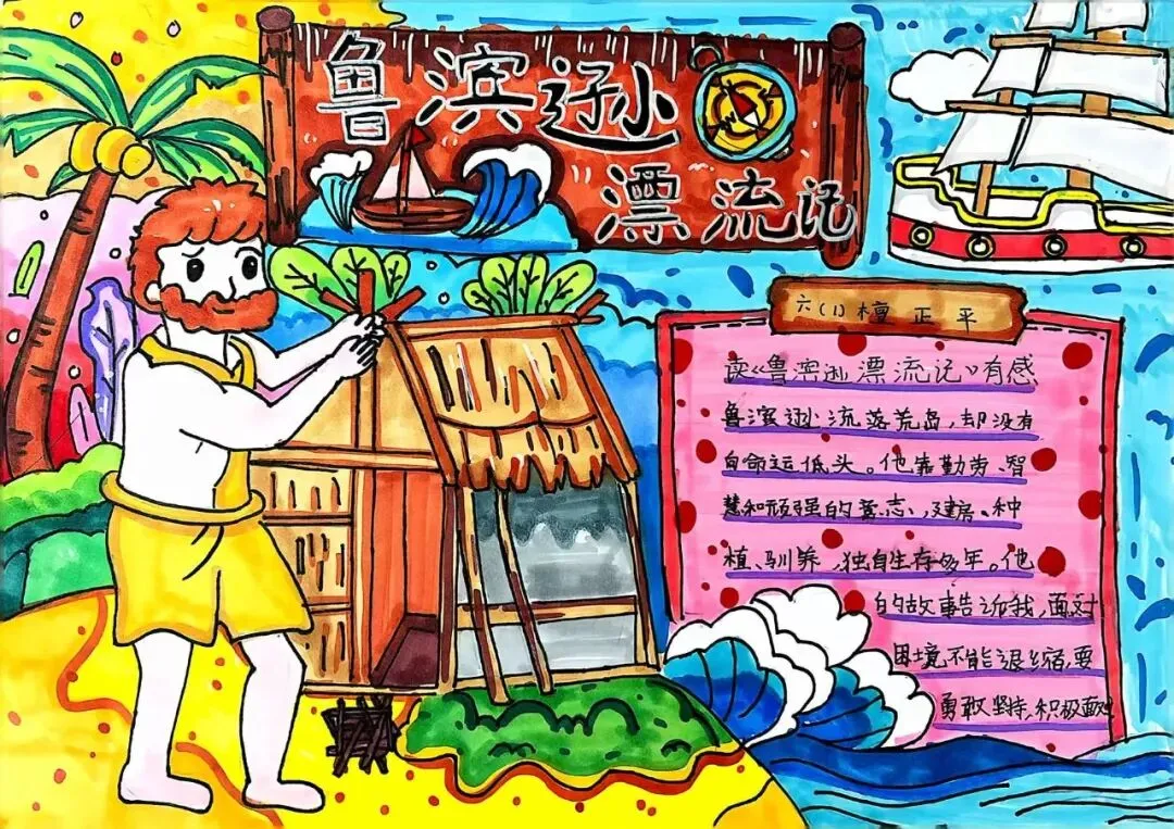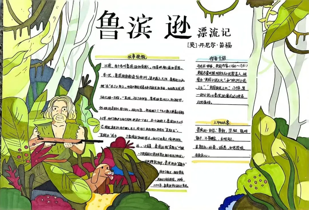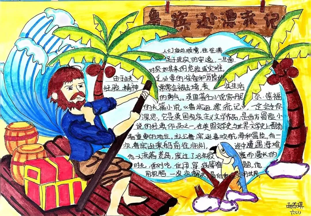 六年级的同学们则阅读了《鲁滨逊漂流记》,用画笔还原鲁滨逊在荒岛的生存场景,用文字记录他的坚韧与智慧。不仅再现了故事情节,更有对勇气、乐观与创造精神的感悟,展现出面对困难时永不放弃的成长力量。