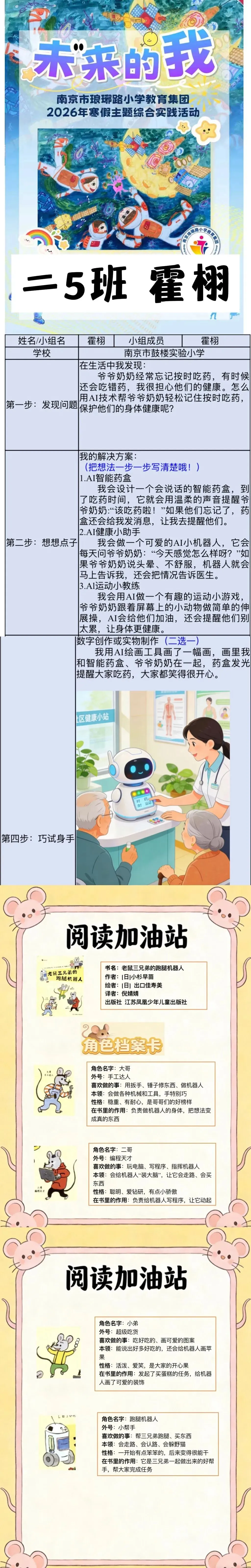 二(5)班的霍栩同学用一份充满温度的寒假实践作业,诠释了“科技向善”的童真力量。他的目标,是用人工智能的智慧,为爷爷奶奶的晚年生活筑起一道健康与快乐的防线——成为一名“银发科技守护者”,让爱与关怀,随科技之光温暖每一寸时光。