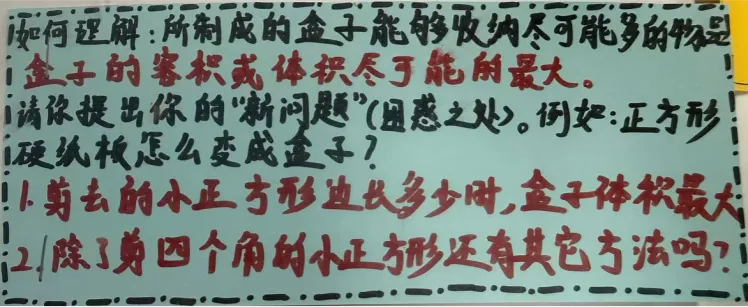 该任务以其具象的物理操作性和内在的数学结构,为学生创造了“提出问题—分析问题—再次提出新的问题—设计方案—筛选方案—实施方案—数据收集—总结反思”的完整探究循环。教学设计的核心理念在于:将认知冲突视为“发现”过程的引擎,通过精心设计的学习情境,让学生在“做数学”和“说数学”中,亲自遭遇并解决概念、方法、数据和表达层面的矛盾,从而促使数学概念、原理和方法从他们自身的思维活动中自然生长出来,最终深刻理解数学不仅是工具,更是一种思考世界的方式。(一)第一课时:问题提出与方案设计——概念澄清与价值权衡中的认知张力课程在一个具象化的物质性挑战中拉开帷幕:教师向全班展示一张边长为21厘米的普通正方形卡纸,并提出核心任务——“如何将这张纸板制作成一个无盖的长方体盒子,并使其尽可能大?”任务的初始表述有意保持了某种开放性,“尽可能大”这一短语并未被即时赋予精确的数学定义,从而为认知冲突的萌发预留了空间。果不其然,学生的初步反应呈现出显著的多元化与直觉化倾向。一部分学生的注意力被“大”的视觉属性所吸引,他们倾向于制作高耸的筒状结构或拥有宽阔底面的扁平容器,并在小组交流中积极为自己的设计辩护,认为“高就显得大”或“底面积大才能放更多东西”。另一部分学生则表现出对材料利用率的敏感,他们更关注如何减少裁剪浪费,甚至提出完全不同的构造思路。少数学生陷入沉思,未能立即将生活语言“大”与数学概念“体积”建立明确联结。教师并未急于统一认识或直接给出体积公式,而是鼓励所有学生将自己的理解通过草图进行外化表达。一时间,黑板上呈现出形态各异的盒子剖面图,这些图纸成为了学生内在思维状态的可视化载体。这一可视化过程至关重要,它使得个体间隐性的认知差异转变为了群体内显性的观点对照,为后续的概念辨析提供了具体的讨论对象。