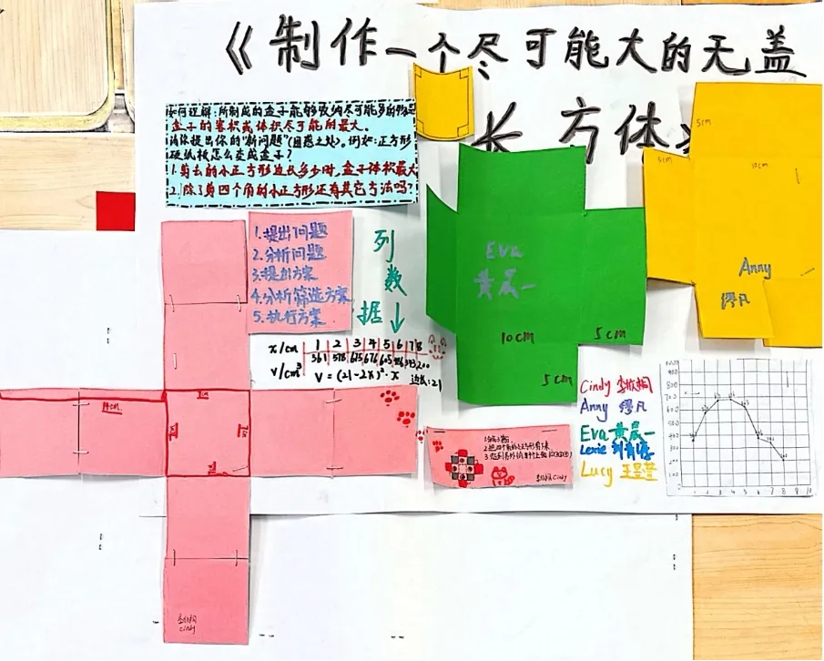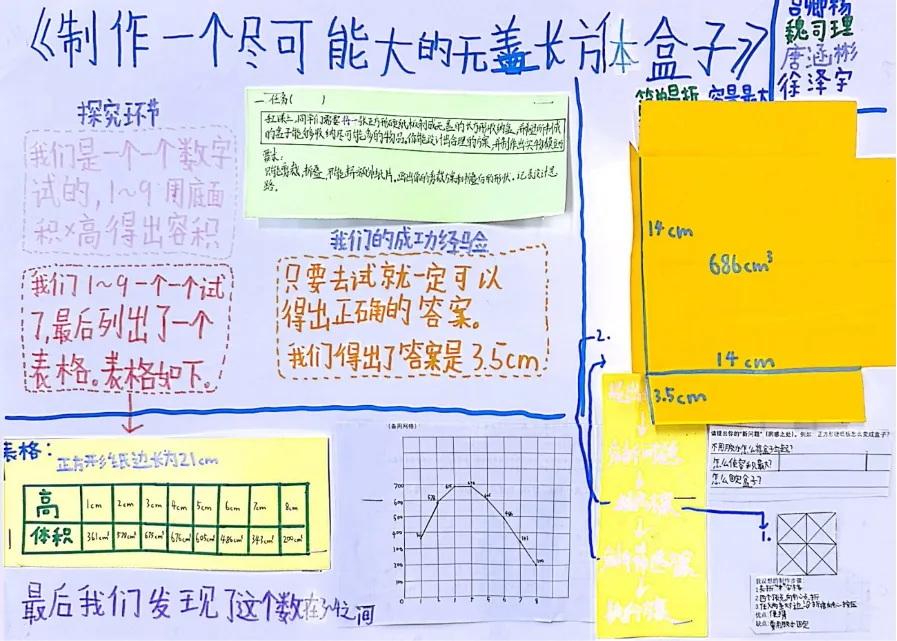 第一组作为开场汇报者,显然将重点放在了“我们做了什么”和“我们发现了什么”上。他们直接切入主题,在大屏幕上展示了数据表格和手绘的散点图,并郑重宣布结论:“经过实验,我们发现当剪去的小正方形边长约为3.5厘米时,盒子的体积最大。”汇报过程简洁明了,但总时长不足五分钟。汇报结束后,教师并未立即点评,而是开放听众提问。立刻有学生举手发问:“请问你们为什么一开始就决定研究剪四角的方法?有没有考虑过其他方法?”另有学生问:“你们选取这些值来测试,是随便选的,还是有什么规律?”面对这些涉及探究缘起和设计逻辑的问题,第一组的成员们显得有些措手不及,他们相互看了看,回答变得支支吾吾:“嗯……因为老师让我们做这个……”“选这些值就是觉得比较有代表性……”这一幕清晰地暴露了学生思维中普遍存在的一种割裂:他们将“探究过程”等同于“操作与计算过程”,而将“问题界定”、“方案论证”、“实验设计原理”等前期重要的思维环节,视为不言自明或无需赘述的背景。他们的汇报呈现了一个“没有开头的故事”。(第二组小组海报一览)