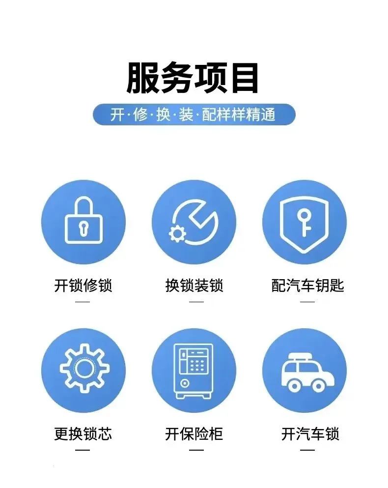 🔓 防盗门开锁、换锁、修锁🔑 高安全锁芯(C级锁芯)升级与更换🚪 指纹锁、密码锁安装与维修🚗 汽车开锁、配车钥匙、遥控器配钥匙🗄️ 保险柜开锁、文件柜开锁🏢 办公室门锁、玻璃门锁修理与更换🔧 各类门锁安装、维修与保养