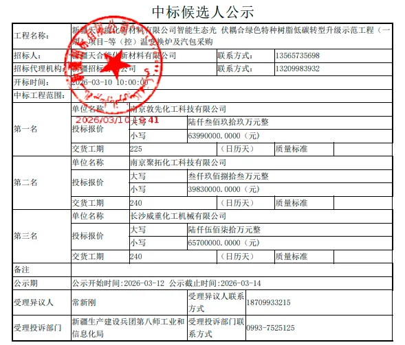 3月12日,全国公共资源交易平台发布新疆天合能化新材料有限公司智能生态光 伏耦合绿色特种树脂低碳转型升级示范工程(一期)项目-等(控)温变换炉及汽包采购中标候选人公示。